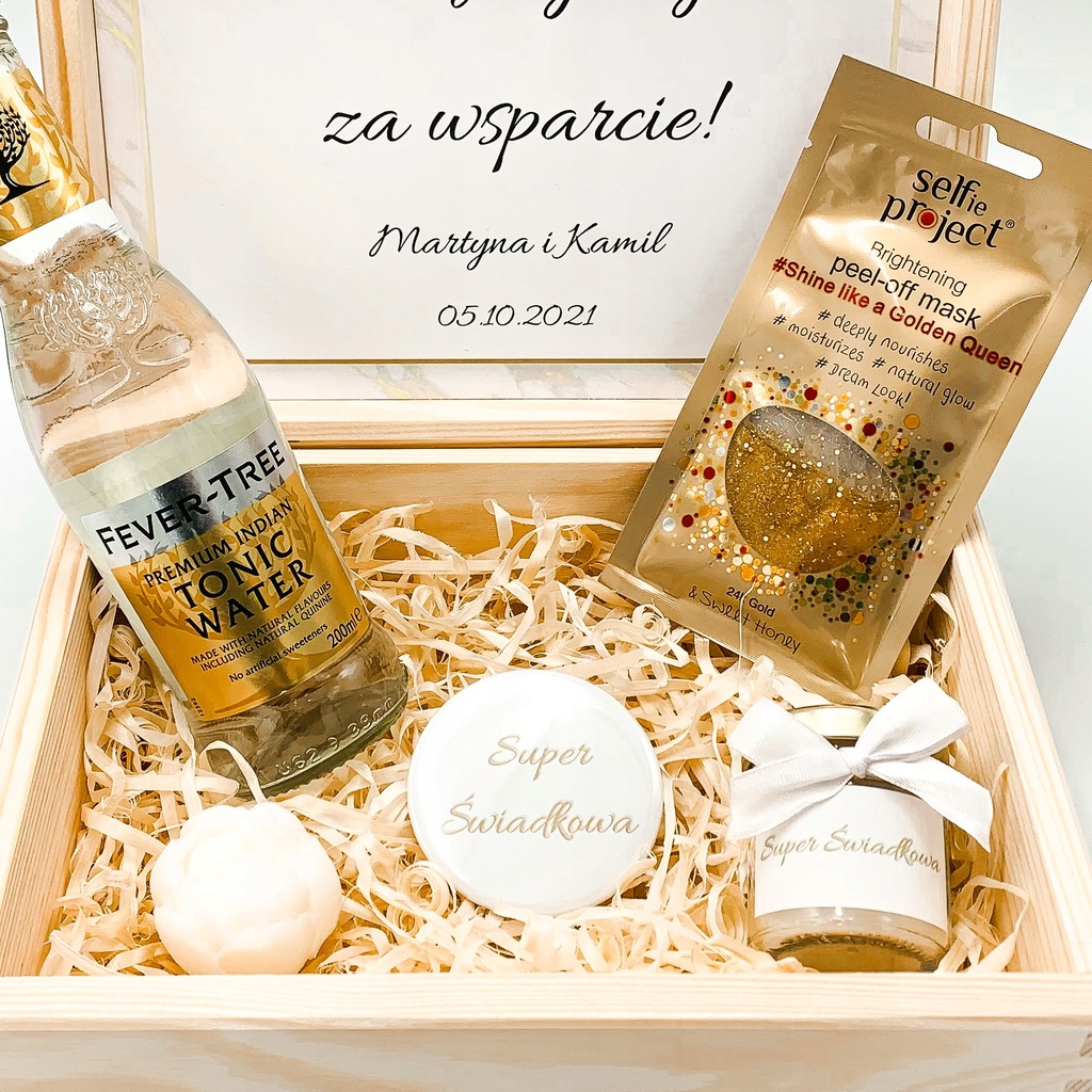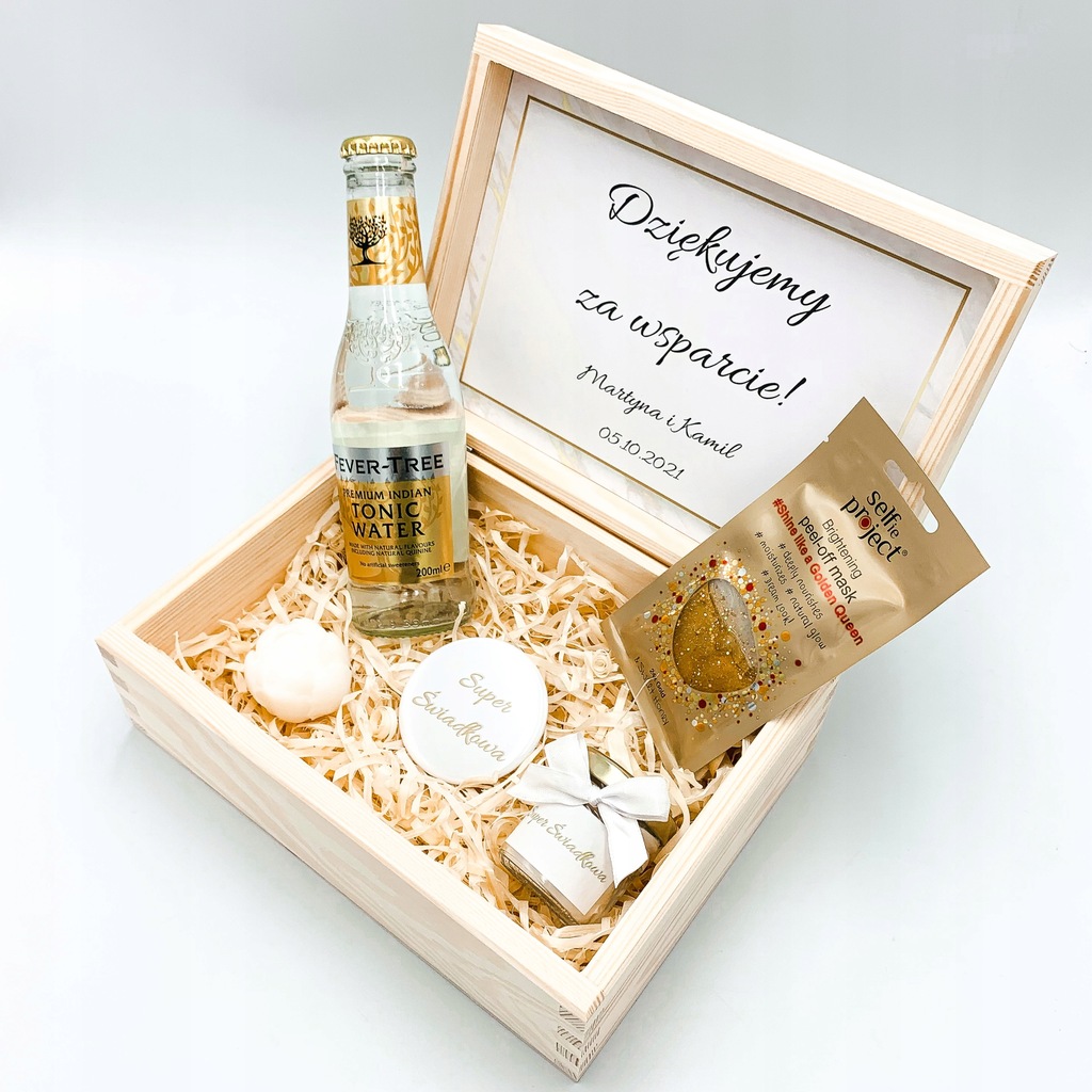 Drewniane pudełeczko w formie podziękowania za świadkowanie. Wewnątrz znajduje się etykieta z napisem widocznym na zdjęciu. Przedstawiony GiftBox to wyjątkowy i oryginalny prezent, który na pewno zachwyci świadkową.