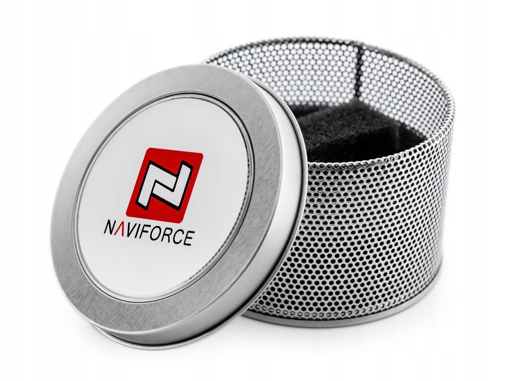 Pudełko metalowe wyłożone gąbką. Na pokrywce logo marki NAVIFORCE.