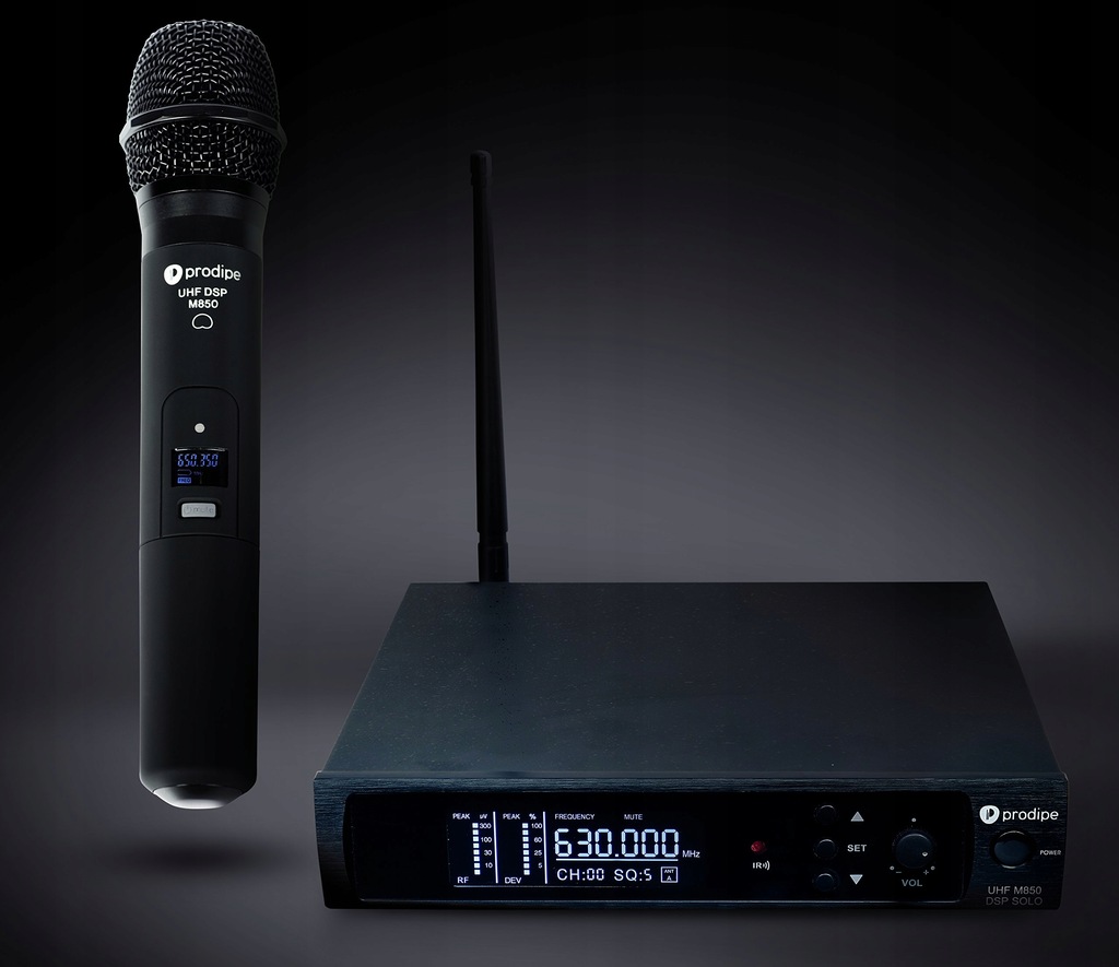 Model Solo systemu mikrofonu UHF M850DSP zawiera praktyczne funkcje, takie jak wyświetlacz notebooka, wskaźnik kanału i przycisk wyciszenia. Odbiornik całkowicie metaliczny zapewnia stabilne połączenie i doskonałą transmisję dźwięku. Produkt marki Prodipe, który zrewolucjonizuje sposób, w jaki korzystasz z bezprzewodowych mikrofonów.