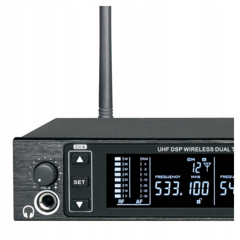 - zestaw monitorujący dźwięk składa się z nadajnika fal ultrakrótkich (UHF), dwóch par dousznych słuchawek oraz dwóch przypaskowych odbiorników bodypack