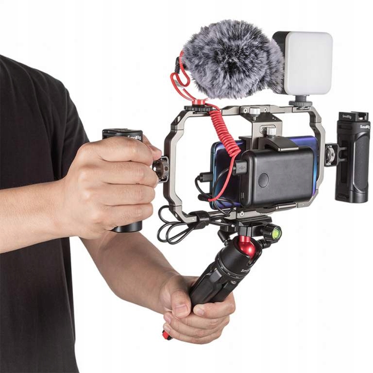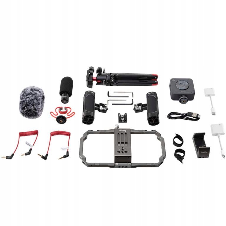 W zestawie znajdziesz funkcjonalny uchwyt do smartfona, uchwyty ręczne, mini statyw z głowicą kulową, mikrofon, mocowanie mikrofonu, osłonę przeciwwietrzną, lampę, okablowanie i adapter do smartfona.