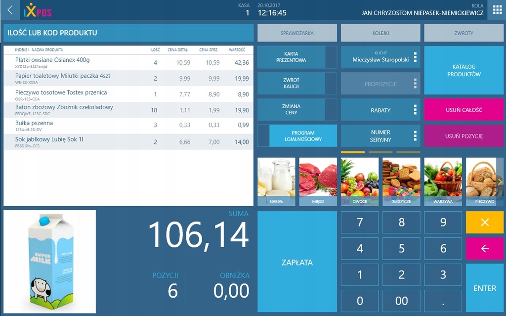 W trakcie obsługi klienta kasjer może wprowadzić produkt za pomocą czytnika kodów kreskowych wpisując nazwę (wprowadzanie kontekstowe) lub po wywołaniu katalogu produktów za pomocą wszystkich mechanizmów wyszukiwania dostępnych w katalogu. Dodatkowo kasjer ma możliwość skorzystania z menu szybkiej sprzedaży umieszczonego nad klawiaturą numeryczną - wybór produktu odbywa się poprzez naciśniecie konkretnego przycisku z oczekiwanym produktem.