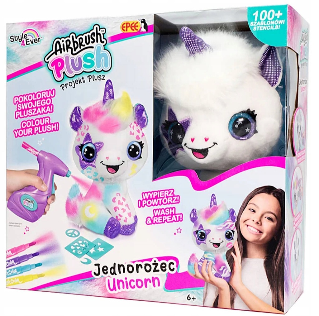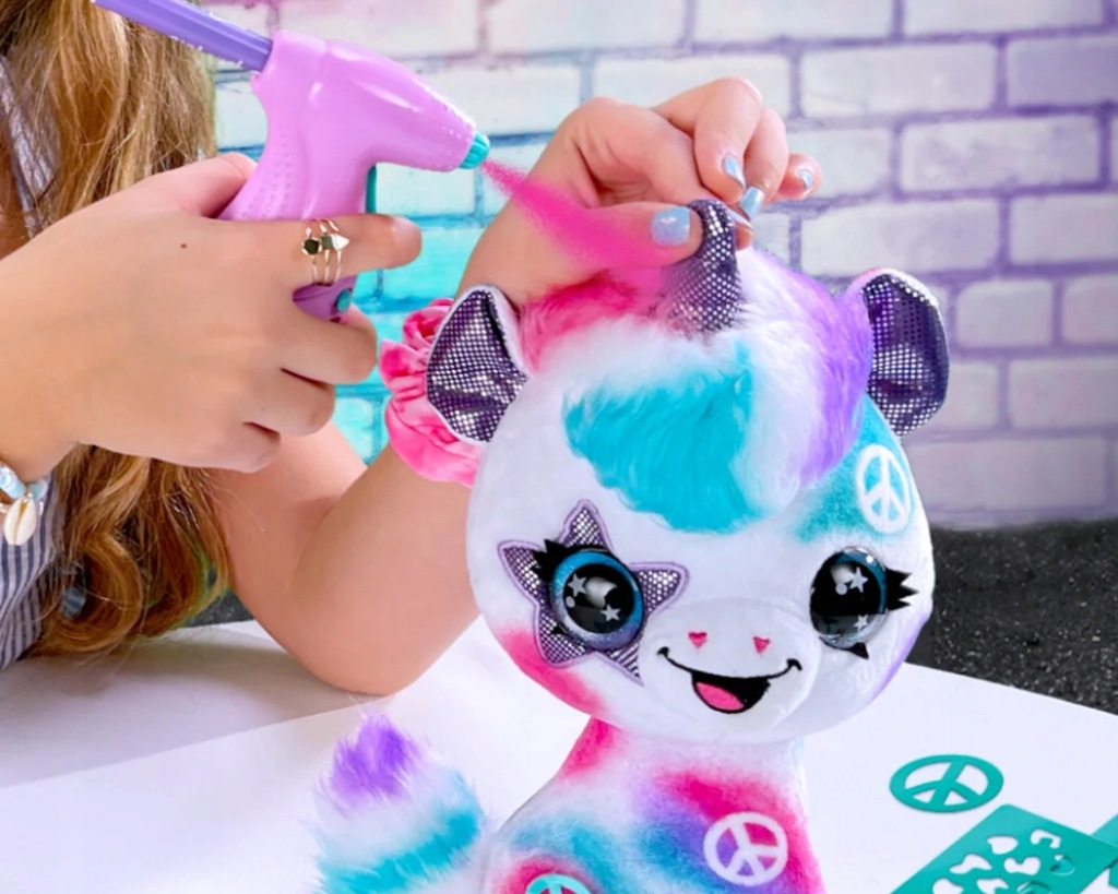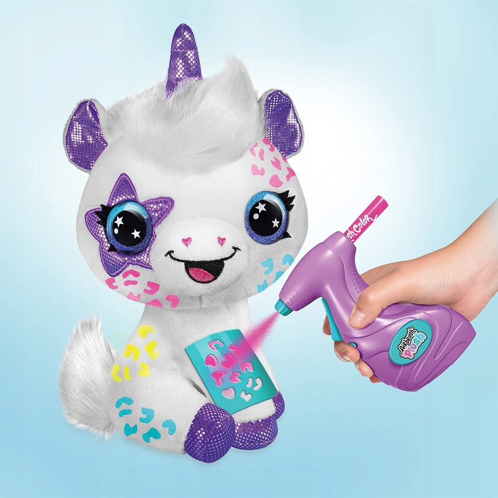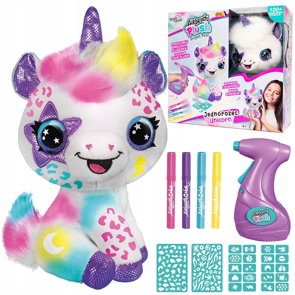 Kto nigdy nie marzył o tym, by ozdobić swojego ulubionego pluszaka? Z tym rewelacyjnym zestawem staje się to takie proste! Nadaj swojej, jedwabiście miękkiej maskotce nowy styl za pomocą łatwego w użyciu aerografu i 4 kolorowych markerów! Stwórz swój wzór odręcznie lub skorzystaj z jednego z ponad 100 wzorów z szablonów. Wypierz i twórz nowe stylizacje dla Twojego zwierzaka, raz za razem! Dzięki bardzo dużej liczbie szablonów możesz cieszyć się wieloma godzinami kreatywnej zabawy!