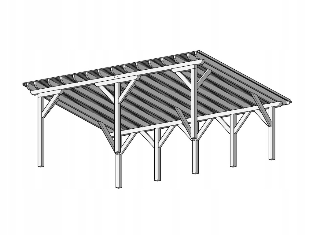 Wiata jednospadowa 5x8m to wygodna i funkcjonalna wiata drewniana dwustanowiskowa zaprojektowana w nowoczesnym stylu. Dach o kącie nachylenia 10 stopni oraz powierzchni połaci prawie 52 m2 stanowi idealne miejsce pod montaż paneli fotowoltaicznych.