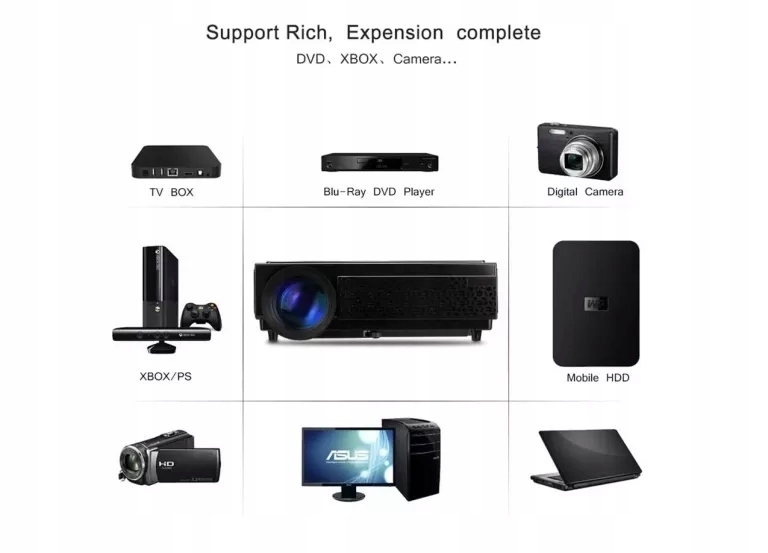 Możesz łatwo podłączyć komputer/laptop przez port HDMI, DVD/dekoder telewizji kablowej przez port AV, PS3 PS4 lub X-Box przez kabel HDMI, aby cieszyć się grami na tak dużym ekranie.