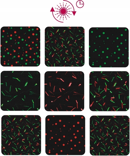 - kolor: projektor wyświetla 10 efektów w kolorach czerwonym i zielonym (stałe, wirujące, wirująco-pulsujące)