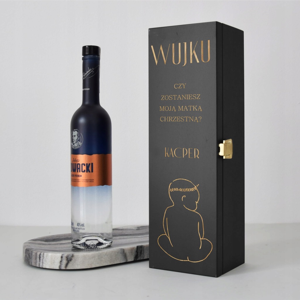 Rodzic chrzestny to ważna rola, której zadaniem jest wspieranie i dbanie o swojego chrześniaka. Zapytaj bliską osobę o zostanie Matką Chrzestną lub Ojcem dla swojego dziecka. Ważne pytanie zadaj w elegancki i oryginalny sposób. Spersonaizowana skrzynka na alkohol to upominek, który podkreśla rangę wydarzenia i rolę jaką będą pełnili dla naszej pociechy Rodzice Chrzestni.