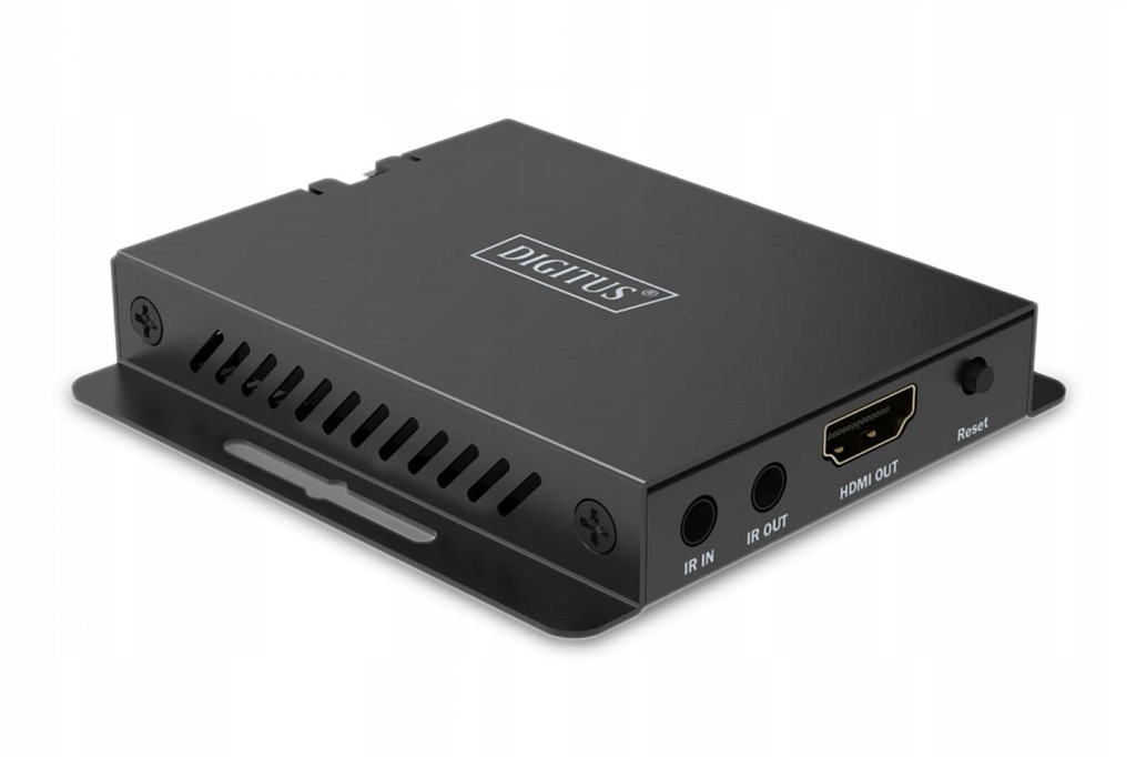 - Złącza modułu odbiornika: 1 x wyjście HDMI (4K / 120Hz) - do podłączenia wyświetlacza 1 x wejście RJ45 - do podłączenia kabla CAT do transmisji 1 x wyjście na podczerwień - podłączenie przekaźnika na podczerwień 1 x wejście na sygnał podczerwieni - podłączenie od odbiornika na podczerwień 1 x wejście na zasilacz (DC 12 V / 1 A) - podłączenie zewnętrznego zasilacza 1 x przycisk reset 1 x kontrolka LED statusu