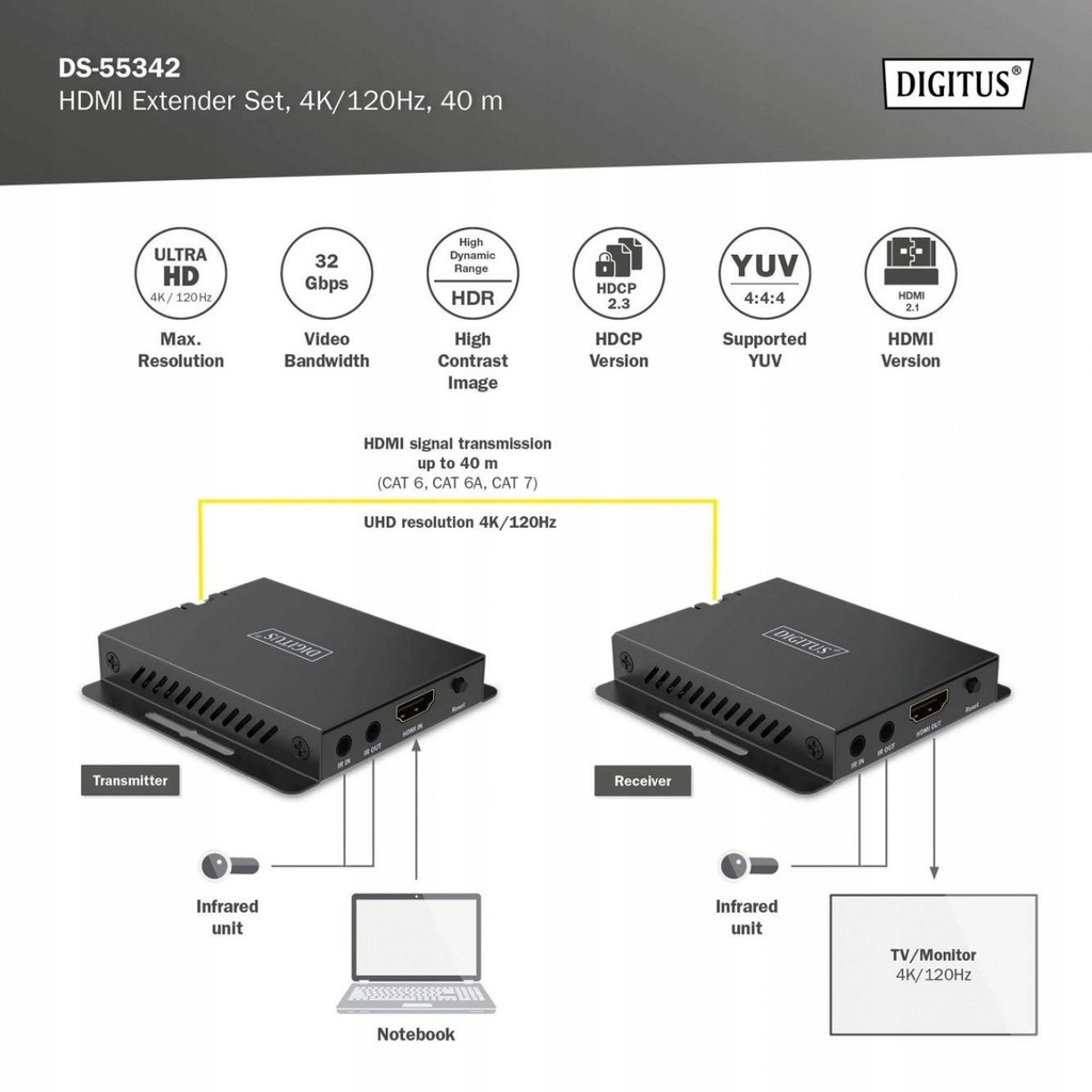 - Transmisja sygnału HDMI (punkt-punkt) na odległość do 40 m w rozdzielczości UHD (4K / 120 Hz, 4:4:4)
