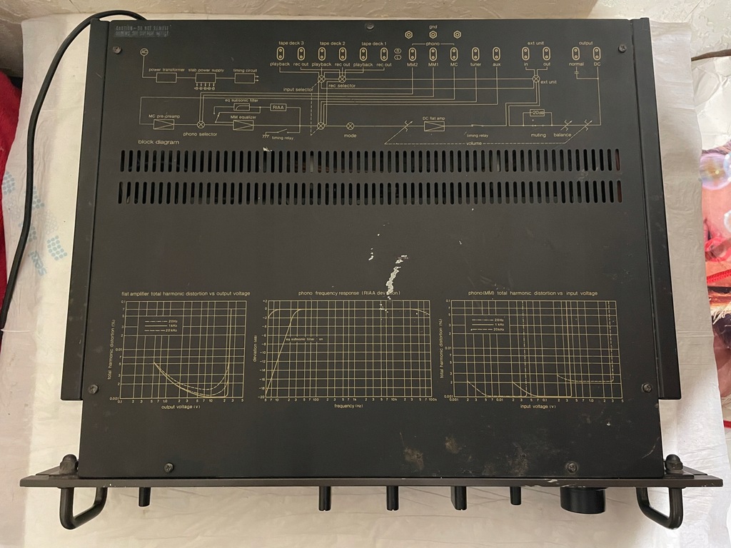 Przedwzmacniacz Technics SU-9070. Stan wizualny widoczny na zdjęciach. Sprzęt ma swoje lata. Był na serwisie, czyszczenie potencjometrów i przełączników. Wymieniono też pare kondensatorów. Sprawny, działa prawidłowo.