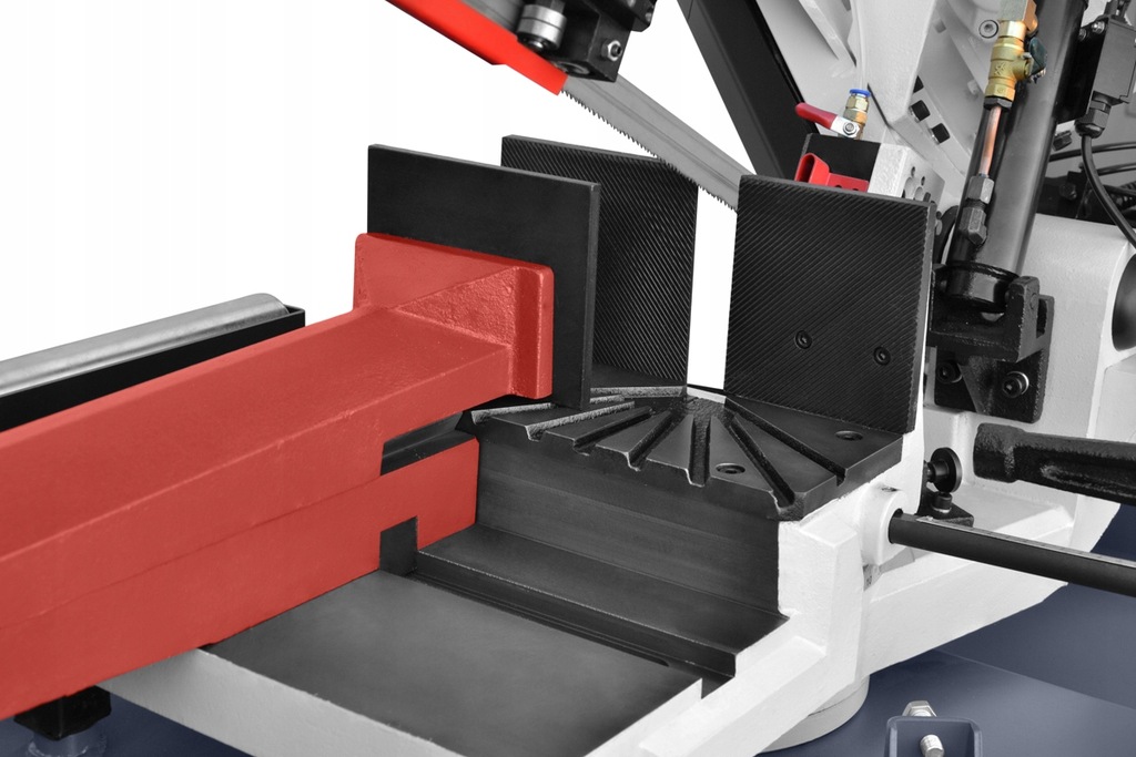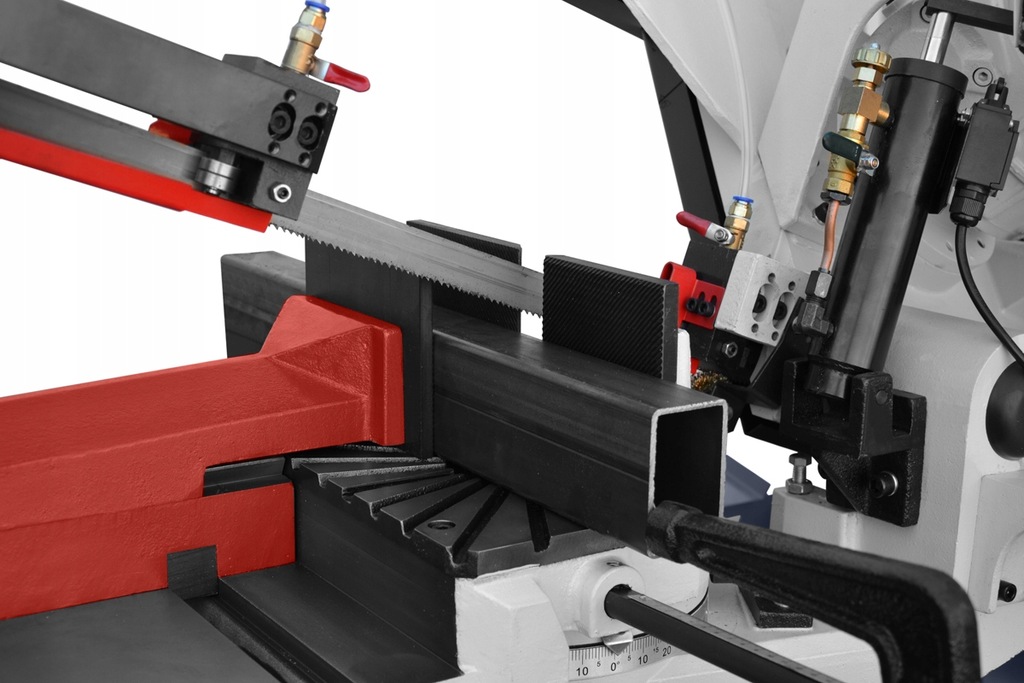 - Precyzja cięcia – prowadnice z węglika spiekanego i tensometr napięcia taśmy gwarantują dokładność.