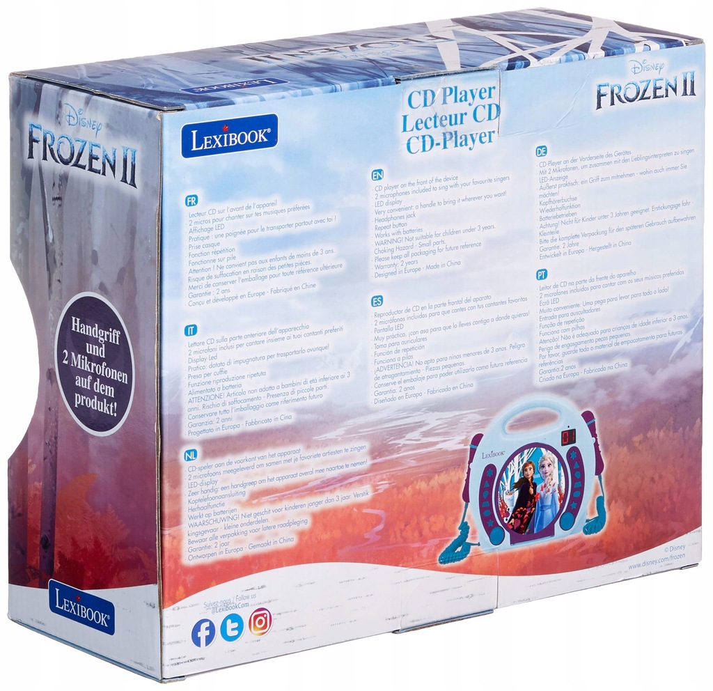 - nazwa przedmiotu: Lexibook Disney Frozen 2, Elsa, Anna & Olaf - odtwarzacz CD z mikrofonami, funkcja programowania, gniazdo słuchawkowe, dla dzieci, zasilany zasilaczem lub bateriami, niebieski/fioletowy, RCDK100FZ