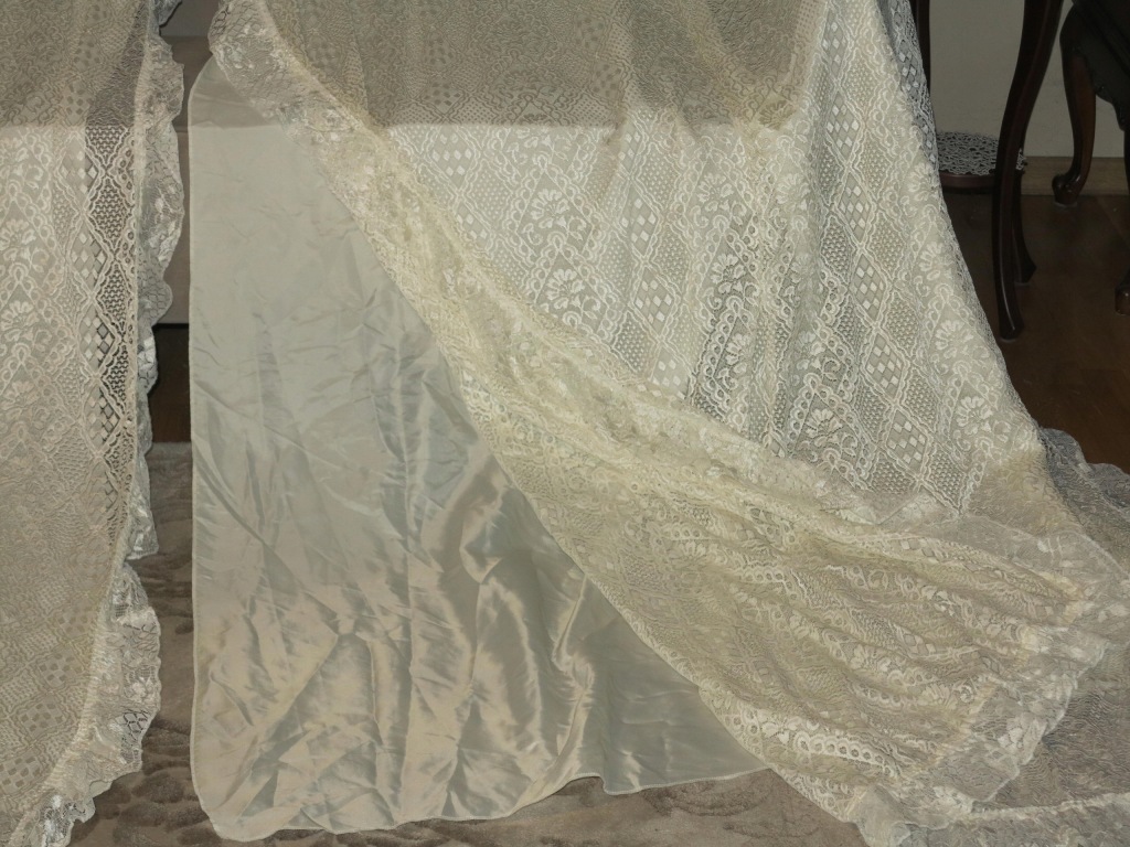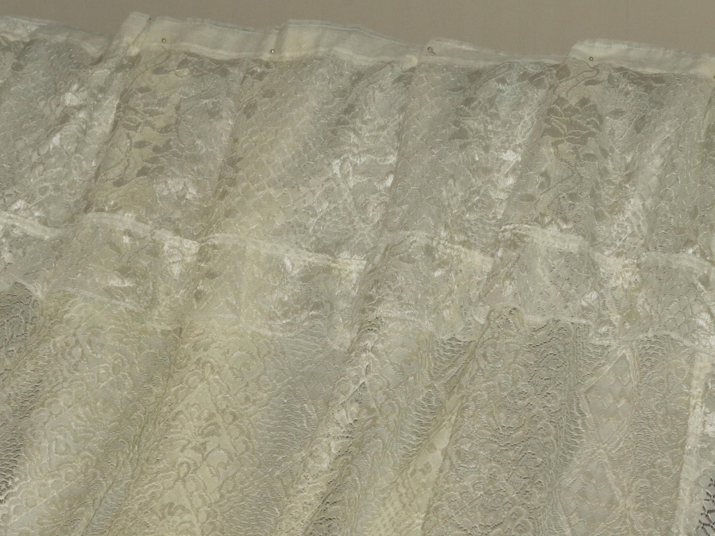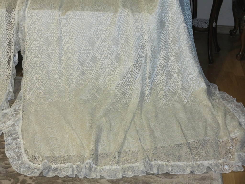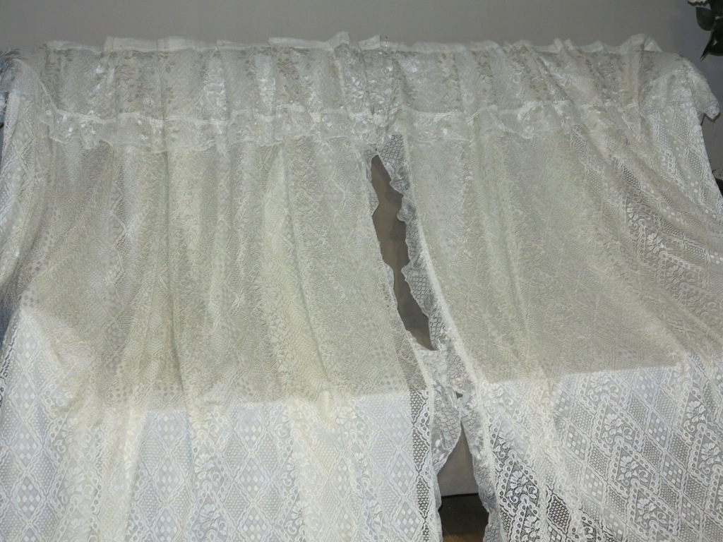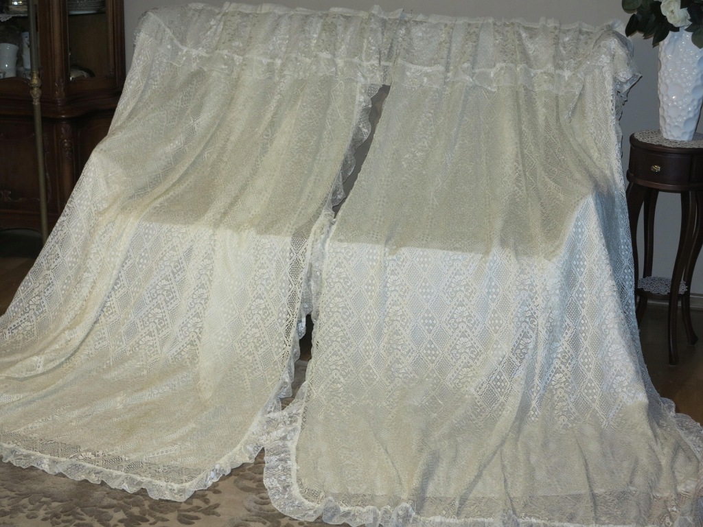NIEZWYKLE UROCZY, ROMANTYCZNY, ANGIELSKI KORONKOWY KOMPLET USZYTY JAKO CAŁOŚĆ: ZASŁONY WRAZ Z LAMBREKINEM. ZARÓWNO BOKI JAK I LAMBREKIN WYKOŃCZONE FALBANKAMI. ( KOMPLET BARDZO ŁATWO MOŻNA ROZDZIELIĆ NA DWIE ODDZIELNE ZASŁONY- NIEWIELKA PRACA NA MASZYNIE)