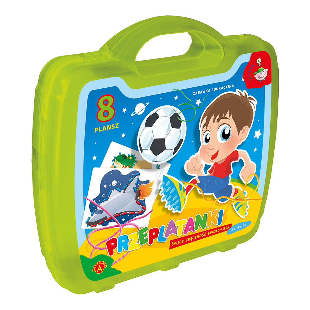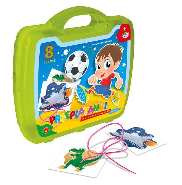 Przeplatanki to zabawa polegająca na przeplataniu kolorowego sznurka przez dziurki umieszczone na obrazku. Zabawka ćwiczy zręczność, cierpliwość, precyzję. Jest doskonałym wstępem dla dzieci do nauki wiązania butów oraz kokardek. Zestaw zawiera 8 dziurkowanych obrazków. Całość znajduje się w plastikowej walizce.