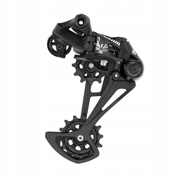 Przerzutka tylna Sram NX Eagle przeznaczona jest do napędów 1x12. Konstrukcja X-Horizon umożliwia obsługę kaset 10/11-50T i zapewnia płynną oraz precyzyjną zmianę przełożeń. Przerzutka wyposażona jest w sprzęgło Type 3, które dba o odpowiednie napięcie łańcucha. Zapewnia to stabilność układu napędowego nawet na najbardziej wyboistym terenie. Funkcja Cage Lock pozwala zablokować wózek w pozycji serwisowej, co znacznie ułatwia demontaż koła. 14 zębów dużego kółka dolnego poprawia płynność pracy napędu.