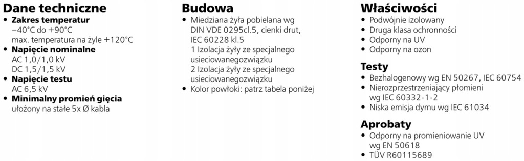 - Bezhalogenowość: Zgodność z normami VDE 0285-525-1/DIN EN 50525-1 oraz DIN EN 50267-2/IEC 60754