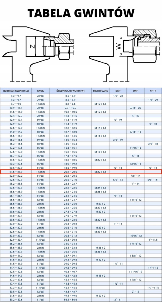 - CEL - wewnętrzny stożek z gwintem zewnętrznym 15L (M22x1.5) i sześciokątem pod klucz – 22 mm