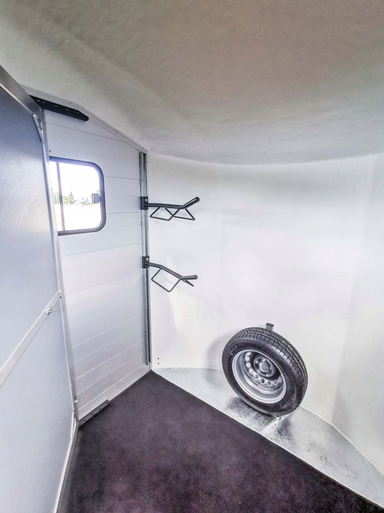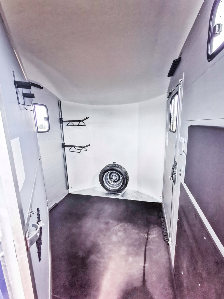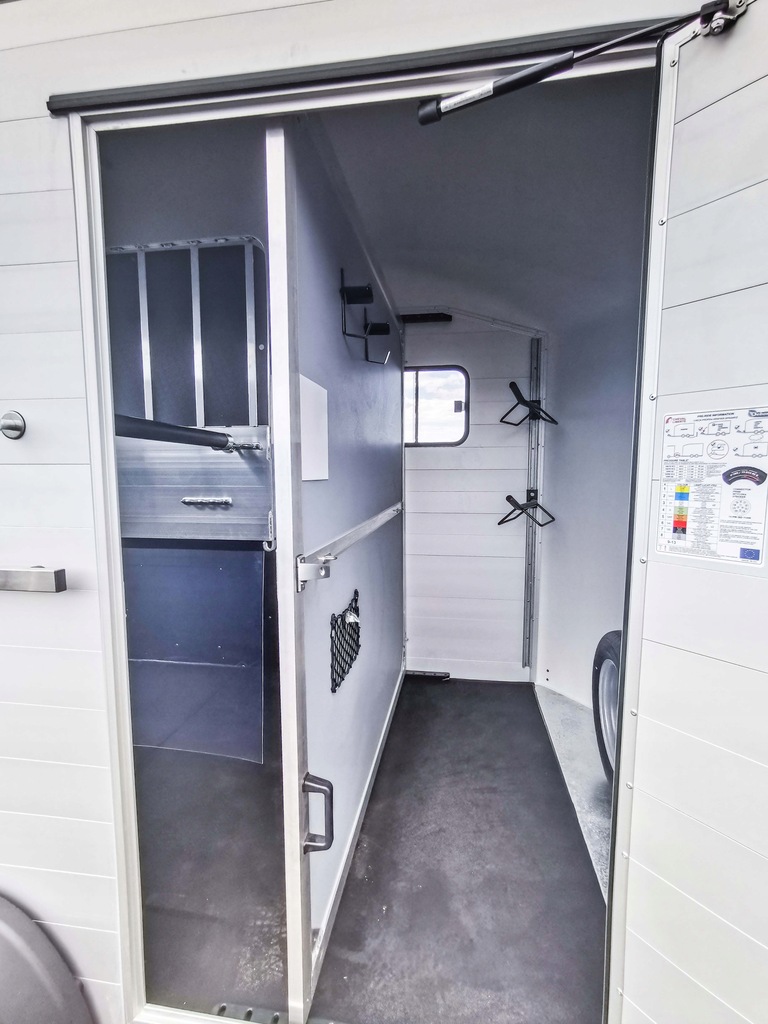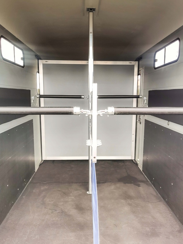 Wyposażona w solidny tylny trap wejściowy z możliwością otwierania na dół i na boki. Przyczepa posiada boki oraz podłogę aluminiową. Przyczepka ma niezależne zawieszenie Pullman 2. Separacja wewnętrzna jest bardzo wygodna w użyciu, posiada między głowie, by rozdzielić głowy końskie.