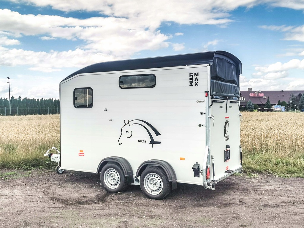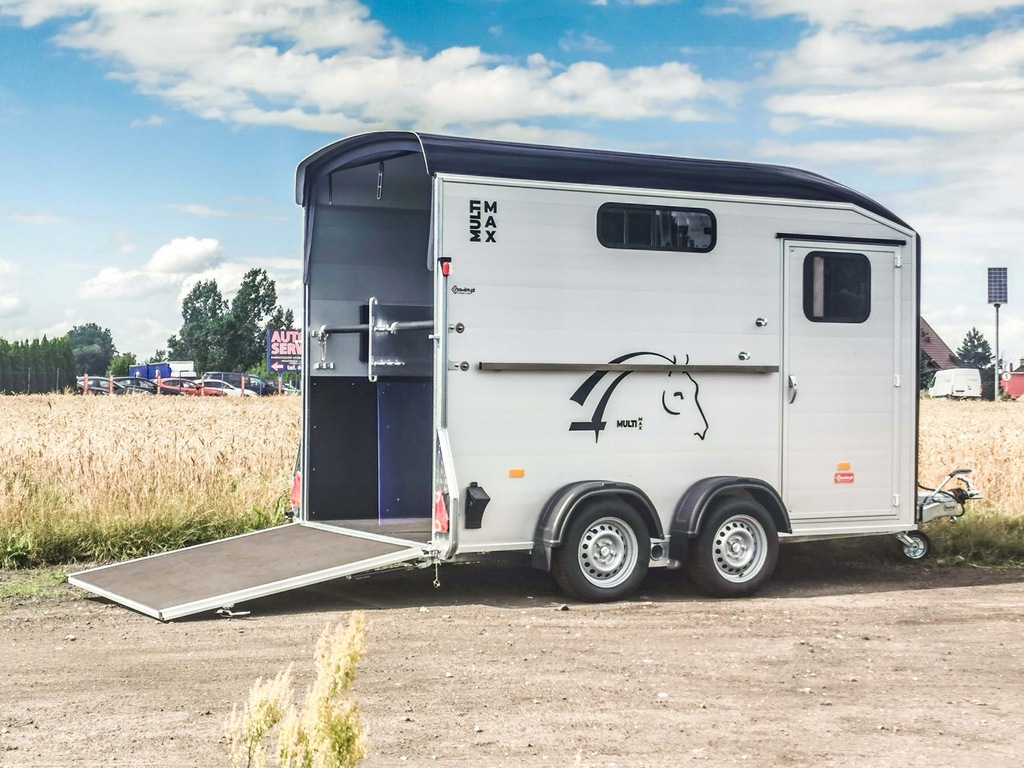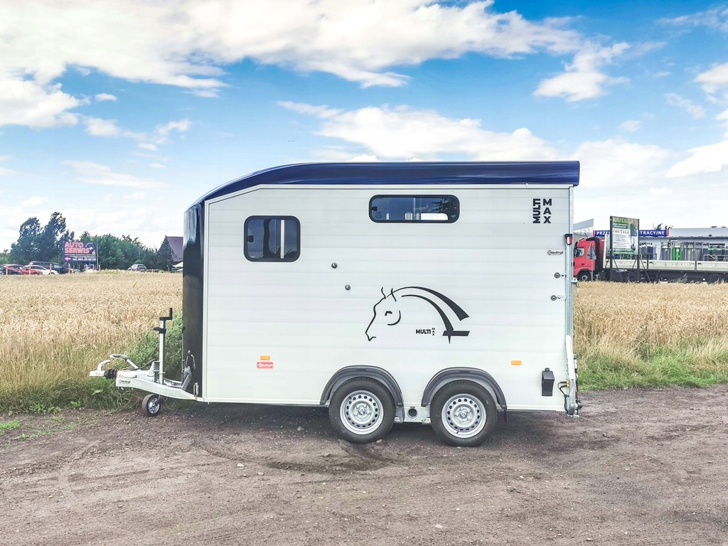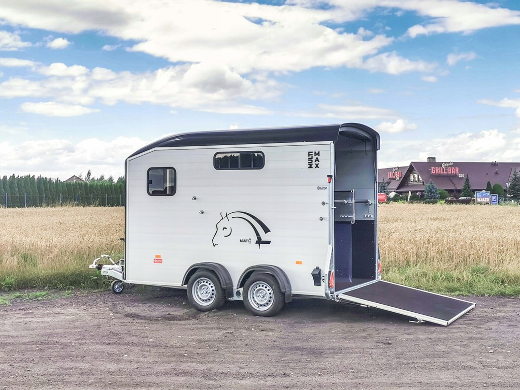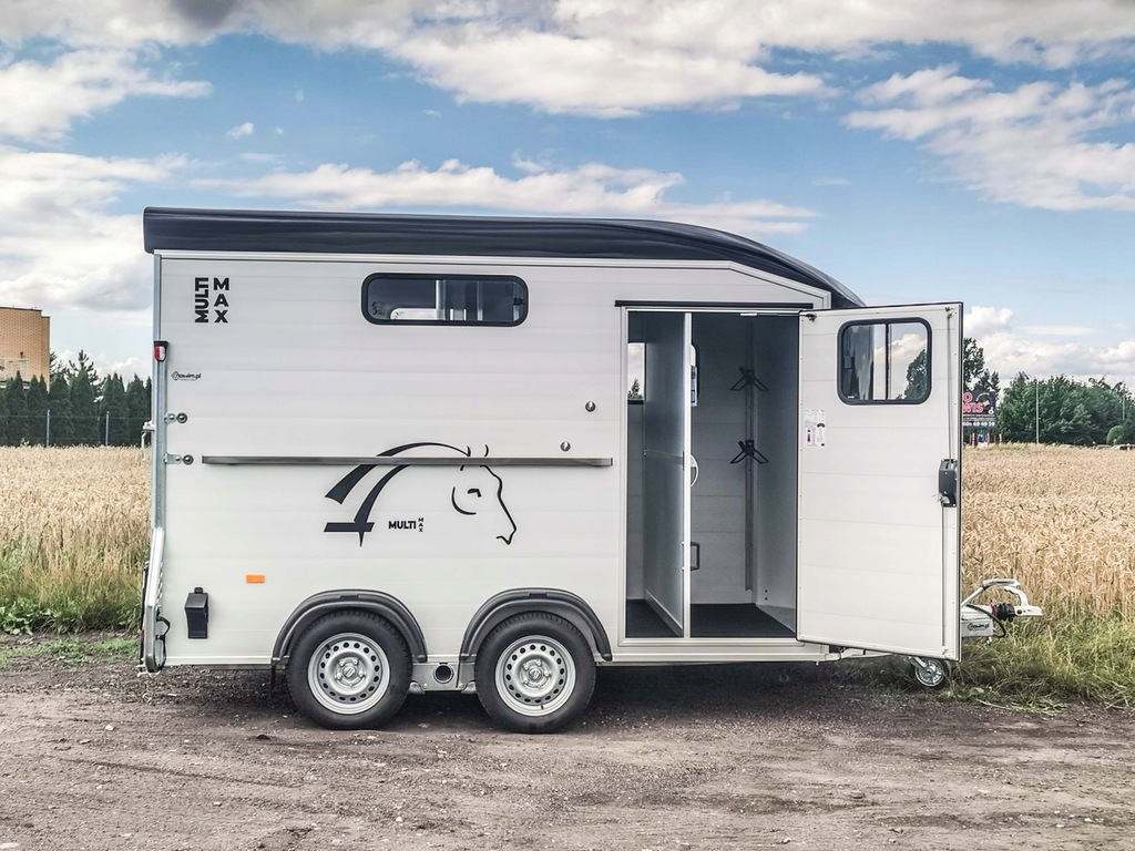 Najnowszy model przyczepy do przewozu koni - MULTIMAX! Model łudząco podobny do MAXI 2. Jednak są różnice między nimi. MULTIMAX to przyczepa stworzona specjalnie z myślą o jeźdźcach i ich wierzchowcach. Posiada bardzo funkcjonalną przegrodę z przodu przyczepy, która z łatwością pomieści nie tylko siodła i inne akcesoria jeździeckie, ale również paki jeździeckie na kółkach, siano.