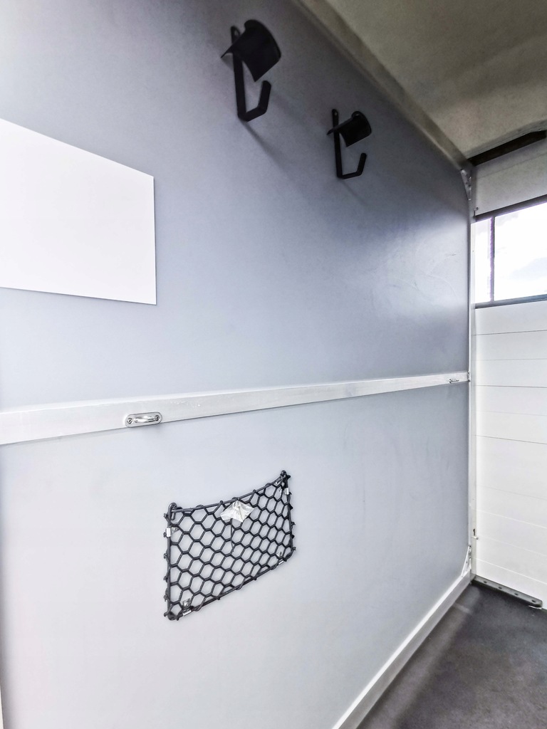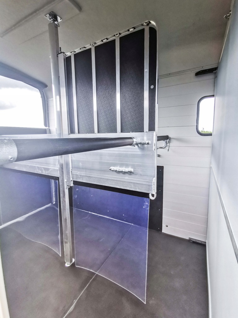Przegroda jest regulowana, więc można sobie jej wielkość bardzo szybko przestawiać wg własnych potrzeb. Model posiada duże drzwi obsługowe doposażone w siłownik gazowy. Jak w pozostałych modelach marki CHEVAL LIBERTE, tak i w tym podłoga jest wyłożona gumą antypoślizgową ułatwiającą sprzątanie.