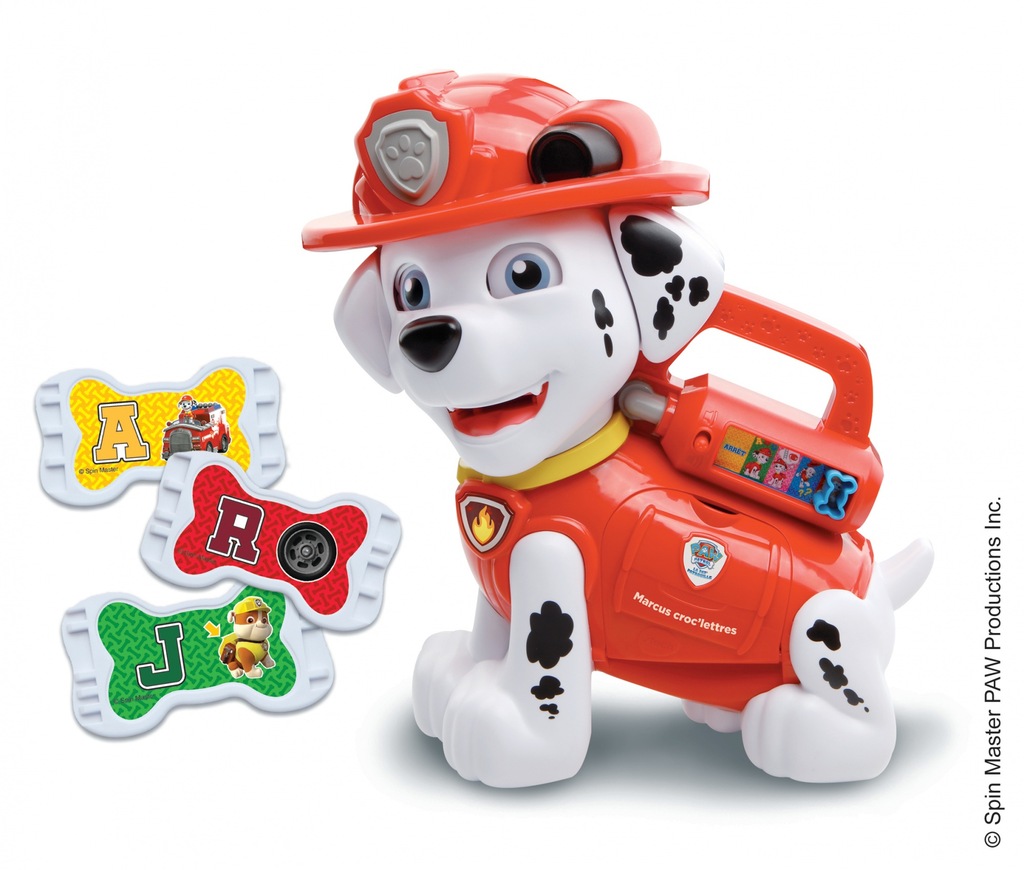 Gadajaca i interaktywna gra z Marcusem, strazakiem Paw Patrol. Dolaczonych 26 liter kosci, aby wstawic do ust, aby odkryc alfabet i slowo zwiazane z kazda litera! Zbyt slodkie, oczy i uszy ozywaja, gdy otrzymuja kosc! Sprytne, wszystkie litery sa przechowywane w brzuchu Marcusa.