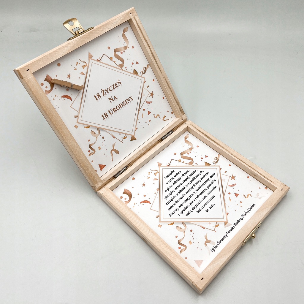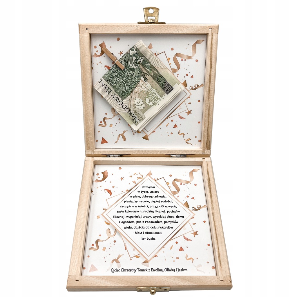Pudełko na banknoty w pięknej drewnianej oprawie to idealna alternatywa dla standardowych kartek / pamiątek okolicznościowych. Na zewnątrz pudełeczka znajduje się grawer wypalony laserem, np.: