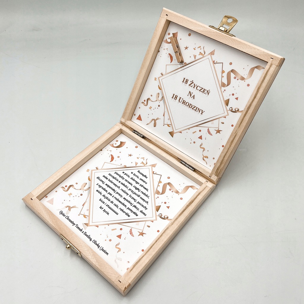 Jeśli prezent ma być na inną okazję niż 18 urodziny, to prosimy o podesłanie życzeń, które mamy wydrukować, lub informację przy zakupie to dodamy swoje.