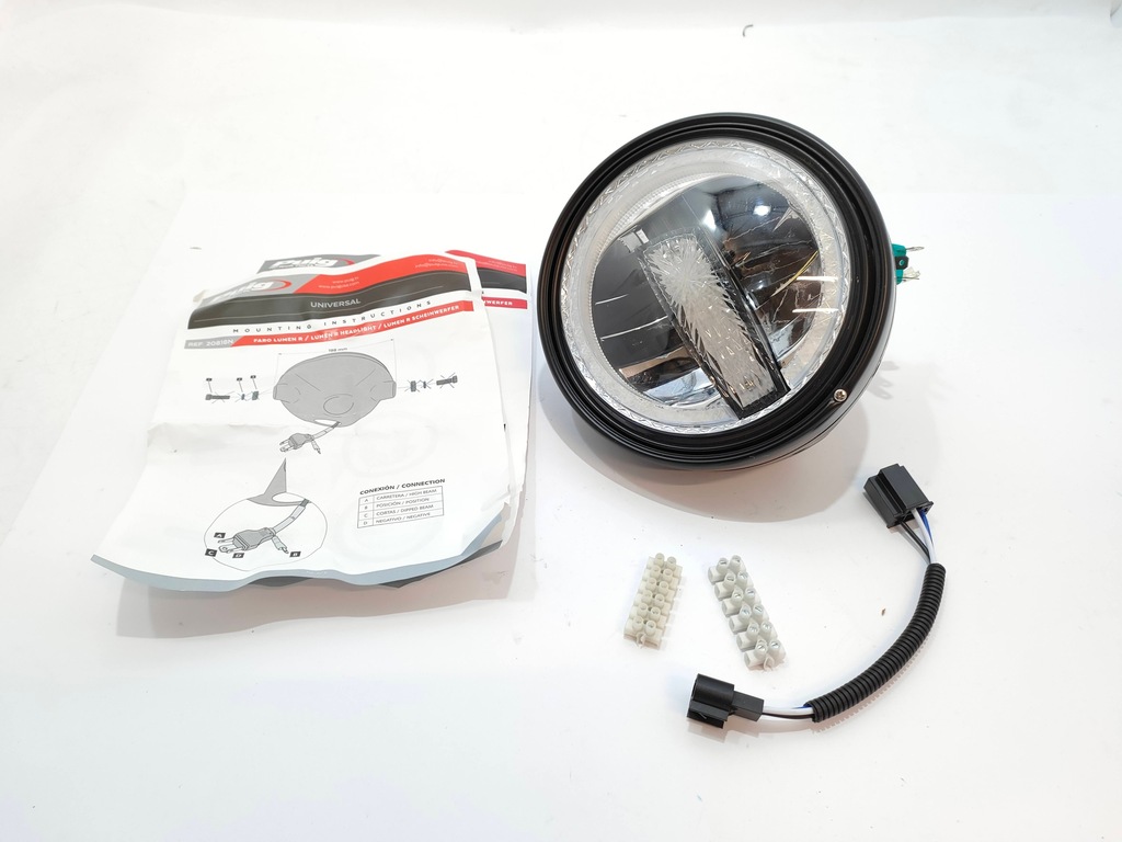 - reflektor LED Lumen R pracuje przy napięciu 12 V, a użytkownik musi wziąć pod uwagę poprzednią technologię oświetleniową, którą montuje jego motocykl, aby nowe reflektory były idealnie dostosowane do układu elektrycznego motocykla