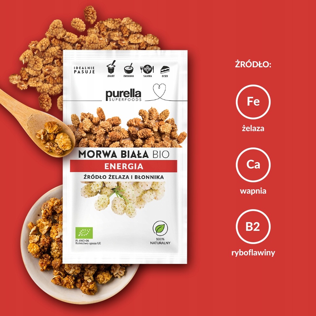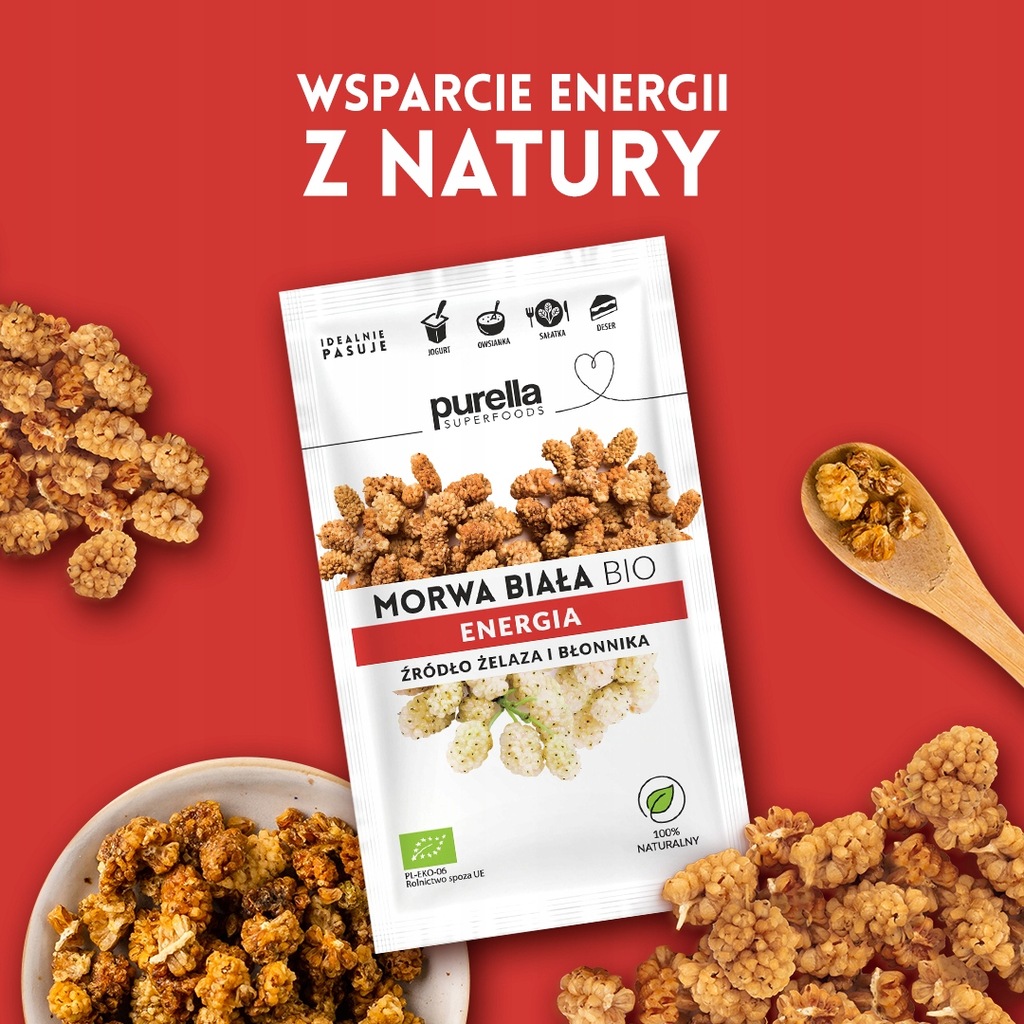 Suszone owoce morwy białej dodają energii, gdyż są źródłem żelaza, które przyczynia się do utrzymania prawidłowego metabolizmu energetycznego oraz do zmniejszenia uczucia zmęczenia i znużenia.