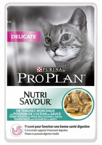 Purina Pro Plan Delicate to wyjątkowo delikatna i smaczna karma przeznaczona dla kotów z wrażliwym przewodem pokarmowym. Karma zawiera również kwasy Omega-3 z DHA i EPA, które korzystnie wpływają na skórę oraz sierść kota, która staje się zdrowa i lśniąca.