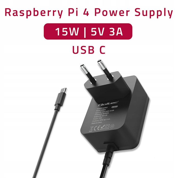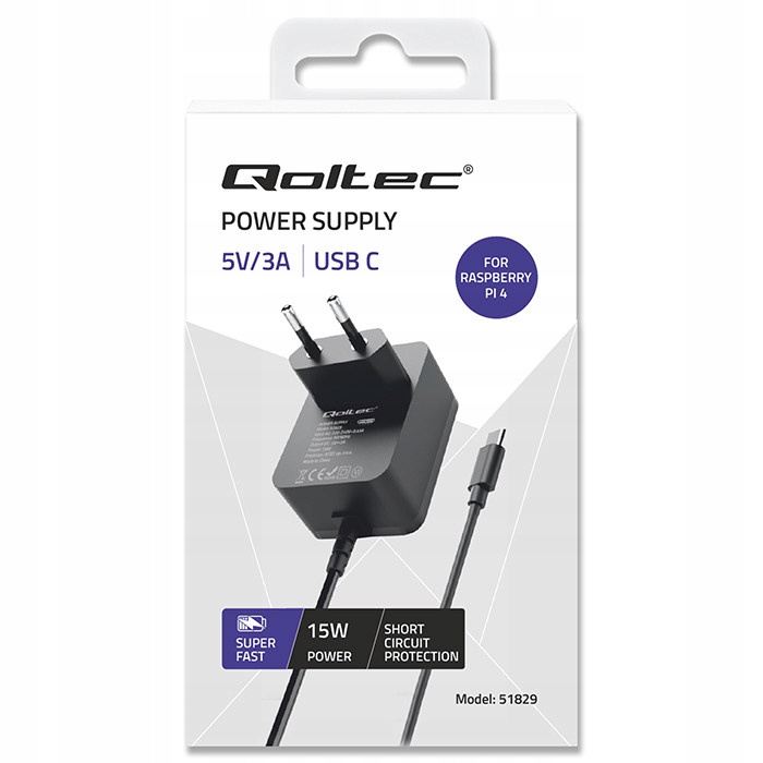 Qoltec Ładowarka Super FAST PD do Raspberry PI 4 | USB-C | 15W | 5V | 3A |