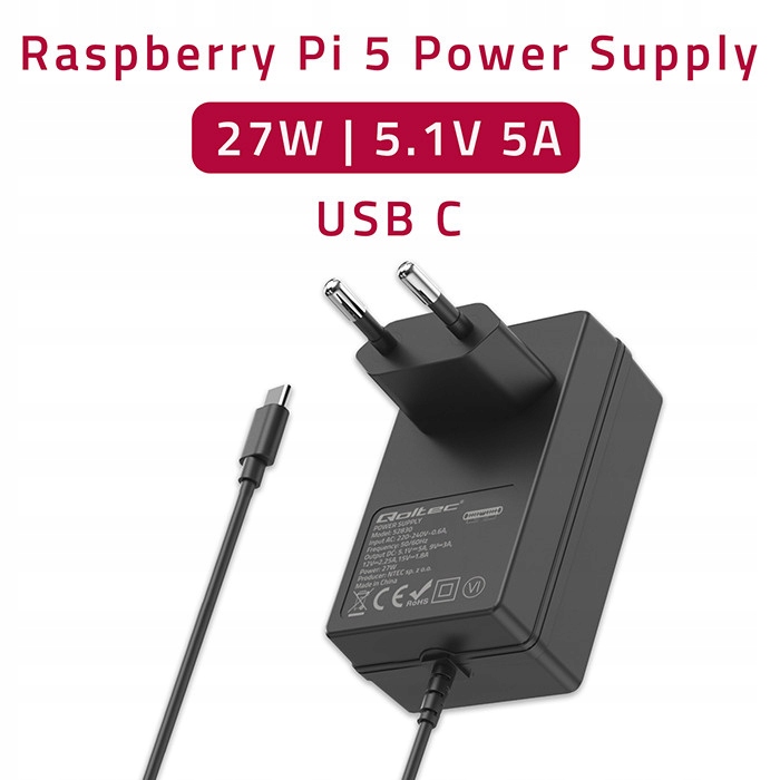 Qoltec Ładowarka Super FAST PD do Raspberry PI 5 | USB-C | 27W | 5.1V | 5A | Czarna