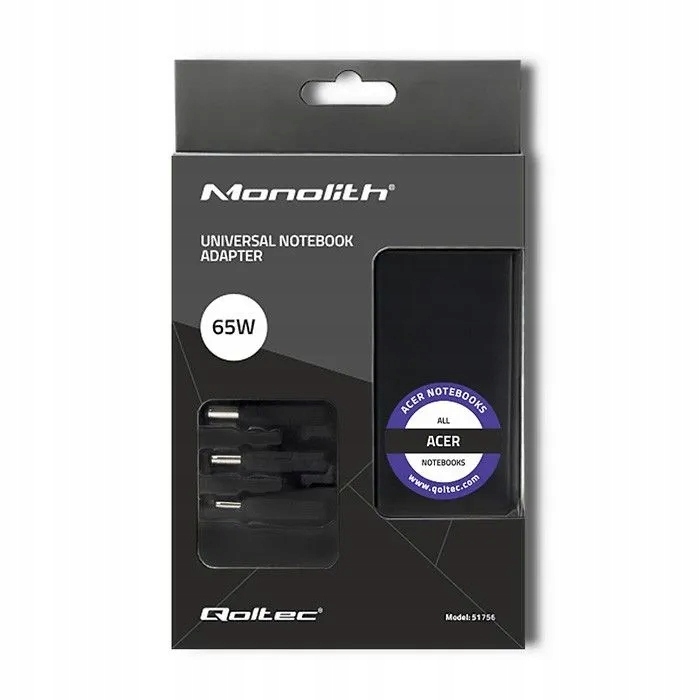 - W zestawie wraz z zasilaczem znajdują się 3 wymienne wtyczki dedykowane różnym modelom laptopów Acer. Zasilacz specjalizowany marki Qoltec jest idealnym rozwiązaniem dla osób, które korzystają z kilku modeli laptopów. Zamiast kilku zasilaczy mamy możliwość wykorzystania jednego produktu kompatybilnego z wszystkimi laptopami Acer.