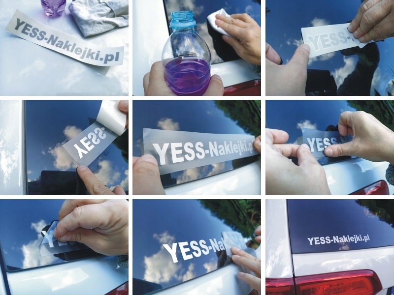 4.Naklejkę przyklej wraz z przeźroczystą folią, zaczynając od jednej strony i dociśnij równomiernie wszystkie elementy naklejki przez folie przeźroczystą,aby usunąć powietrze.