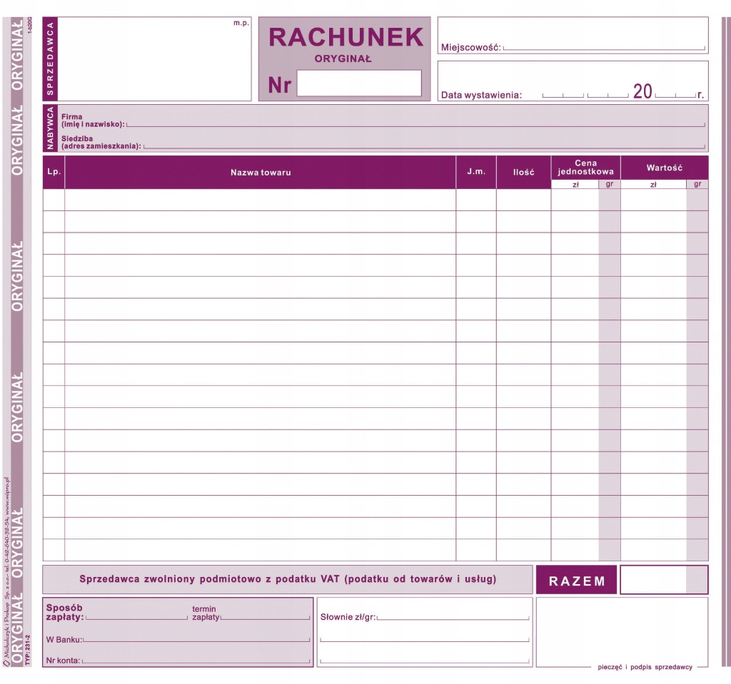 Rachunek dla zwolnionych z VAT 231-2 2/3 A4