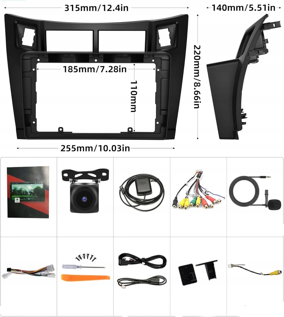 Radio samochodowe Android 2 DIN do Toyota Yaris 2005-2011 (A7301A2516KTA3MI2) z bezprzewodowym CarPlay, nawigacją GPS Android, 9-calowym ekranem dotykowym, Bluetooth, FM/RDS, USB, DAB, HiFi, sterowaniem z kierownicy i kamerą cofania.