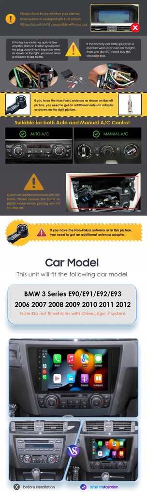 - Radio w 100% kompatybilne z samochodami marki BMW, nie trzeba kombinować i lutować przewodów, wystarczy odpiąć stare radio i podłączyć nowe!