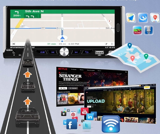 Radio samochodowe z wysokiej jakości z ekranem dotykowym o przekątnej 6.9", które przekształca Twój samochód w prawdziwe centrum multimedialne. Oglądaj ulubione filmy, przeglądaj zdjęcia, podróżuj z darmowymi, aktualizowanymi w czasie rzeczywistym (korki, utrudnienia) mapami Google - po podłączeniu telefonu.