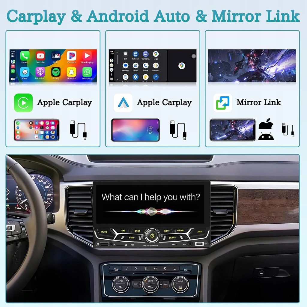 - Połączenie Mirror Link: Radio samochodowe Carplay w formacie 2 DIN obsługuje funkcję Mirror Link dla użytkowników telefonów komórkowych z systemem Android/ISO i do połączenia wykorzystuje oryginalny kabel do transmisji danych telefonu komórkowego. Android obsługuje sterowanie dwukierunkowe, a iOS obsługuje sterowanie jednokierunkowe. W przypadku telefonów z systemem Android przed użyciem należy postępować zgodnie z instrukcjami, aby pobrać odpowiedni program na telefon.