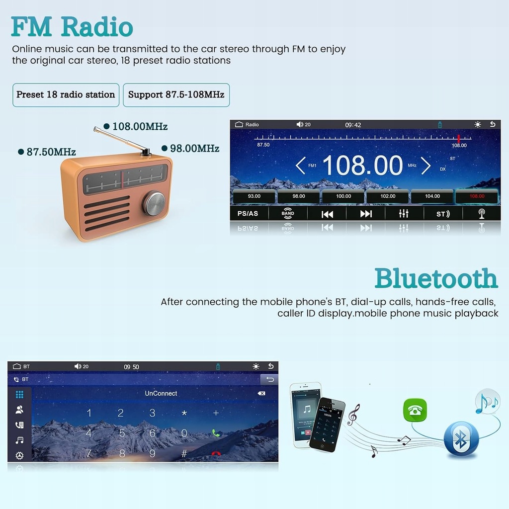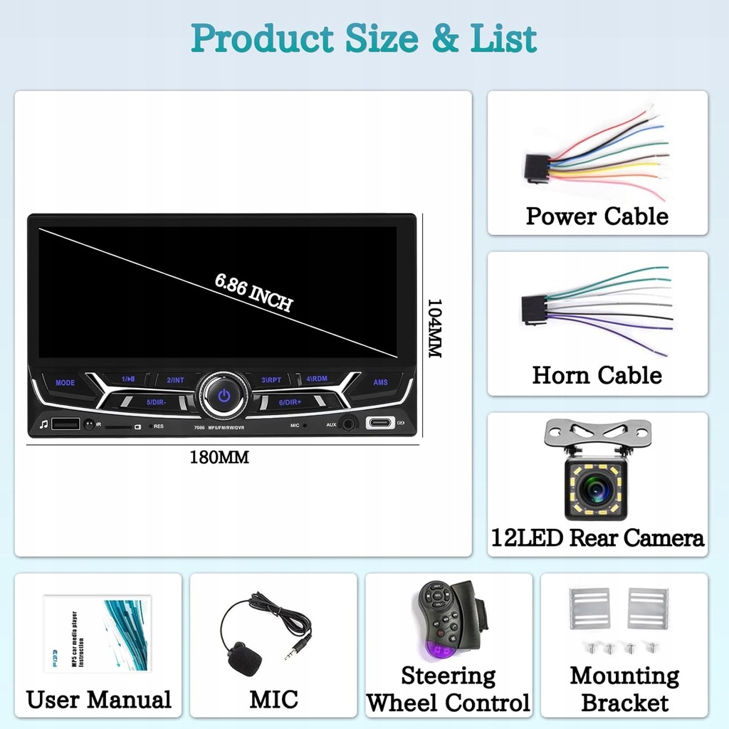 - Radio FM i Bluetooth: radio 2Din z wbudowanym systemem Bluetooth 5.0 o przekątnej 6,86 cala, obsługuje połączenia głośnomówiące Bluetooth, muzykę Bluetooth i synchronizację ów z telefonu komórkowego. Radio FM obsługuje 18 pasm częstotliwości radiowych. Możesz ręcznie wyszukiwać znane stacje radiowe lub automatycznie wyszukiwać inne stacje radiowe