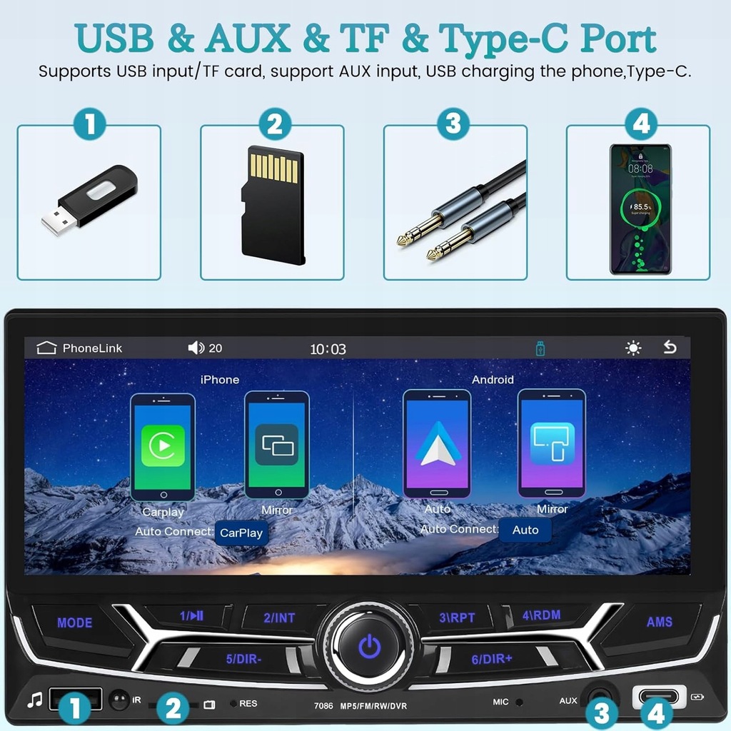 - Radio samochodowe 2Din Carplay: Radio dwudinowe z 6,86-calowym ekranem dotykowym HD, regulacją głośności i interfejsem AUX USB TF z większą różnorodnością opcji odtwarzania. Port TF obsługuje karty pamięci o pojemności do 64 GB. Telefony komórkowe można ładować za pomocą portów USB i Type-C