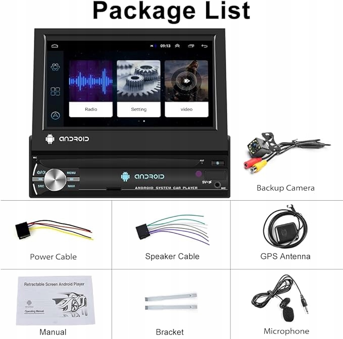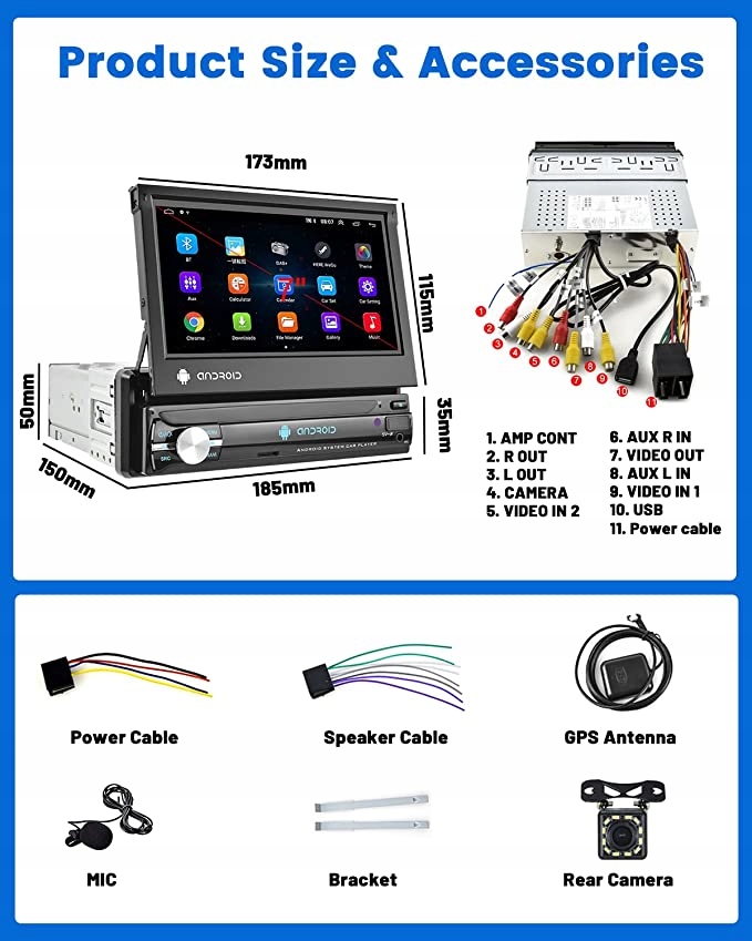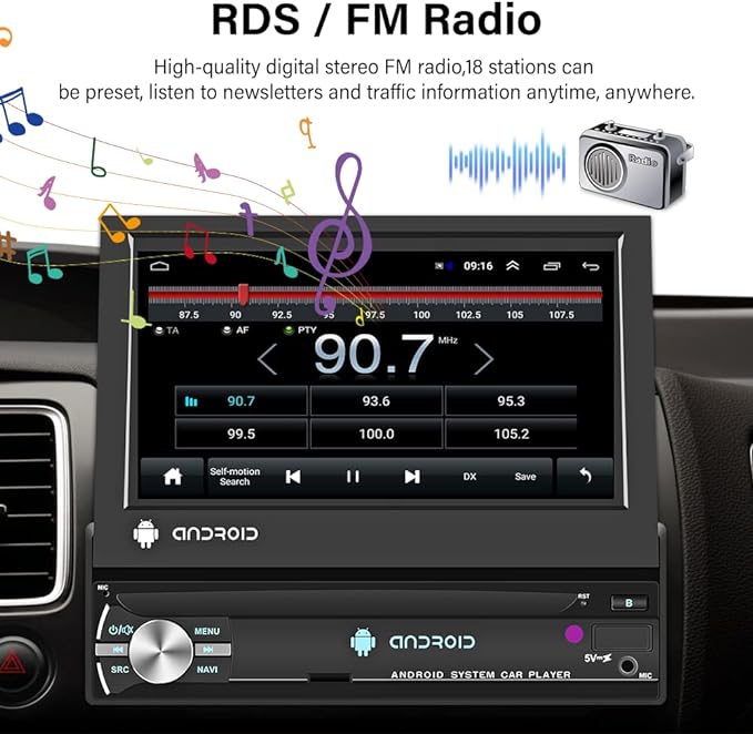 - 7-calowy, ręcznie wysuwany ekran dotykowy: 185 (szer.) x 50 (wys.) x 150 (szer.) mm, panel przedni można ręcznie złożyć w radio. Radio samochodowe z systemem Android, pojemnościowy ekran dotykowy 1024 x 600, obsługuje odtwarzanie wideo 1080p. 7 kolorów podświetlenia klawiszy i ustawień tła ekranu, aby spełnić Twoje indywidualne potrzeby.