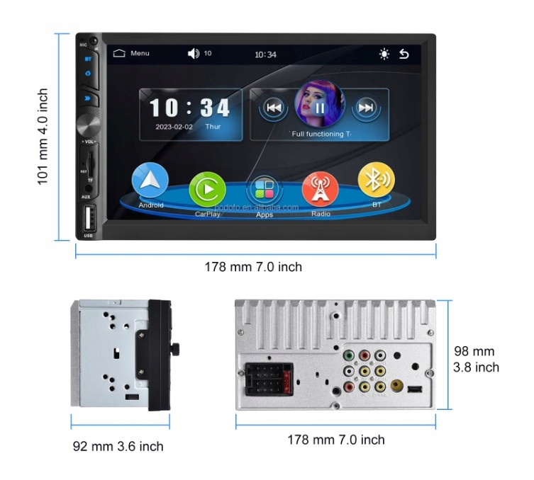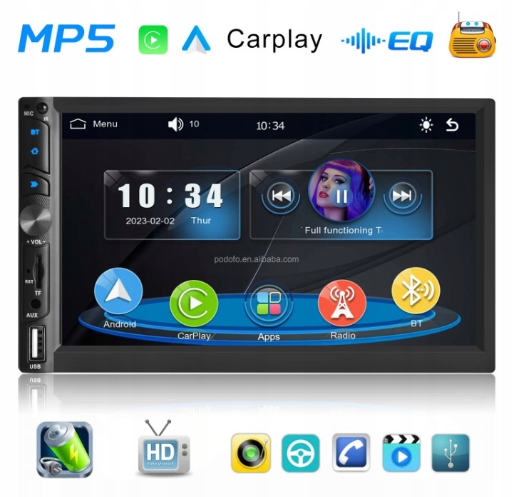 Ten radioodtwarzacz samochodowy, kompatybilny z Apple Carplay, ułatwiający dostęp do funkcji iPhone'a, w tym muzyki, nawigacji po mapach, połączeń, powiadomień, wiadomości i wielu innych