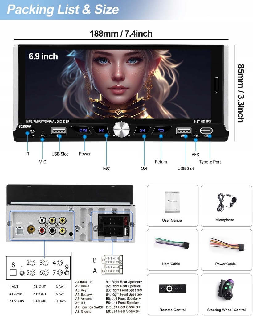 - 【Bezprzewodowe radio samochodowe Carplay 1 din z ekranem】: Radio samochodowe 1 din z ekranem o długości 6,86 cala dla lepszego wyświetlania. Radioodtwarzacz samochodowy obsługuje funkcję pamięci po wyłączeniu, więc nawet jeśli usłyszysz połowę utworu, po ponownym uruchomieniu będzie on odtwarzany od miejsca, w którym został przerwany.