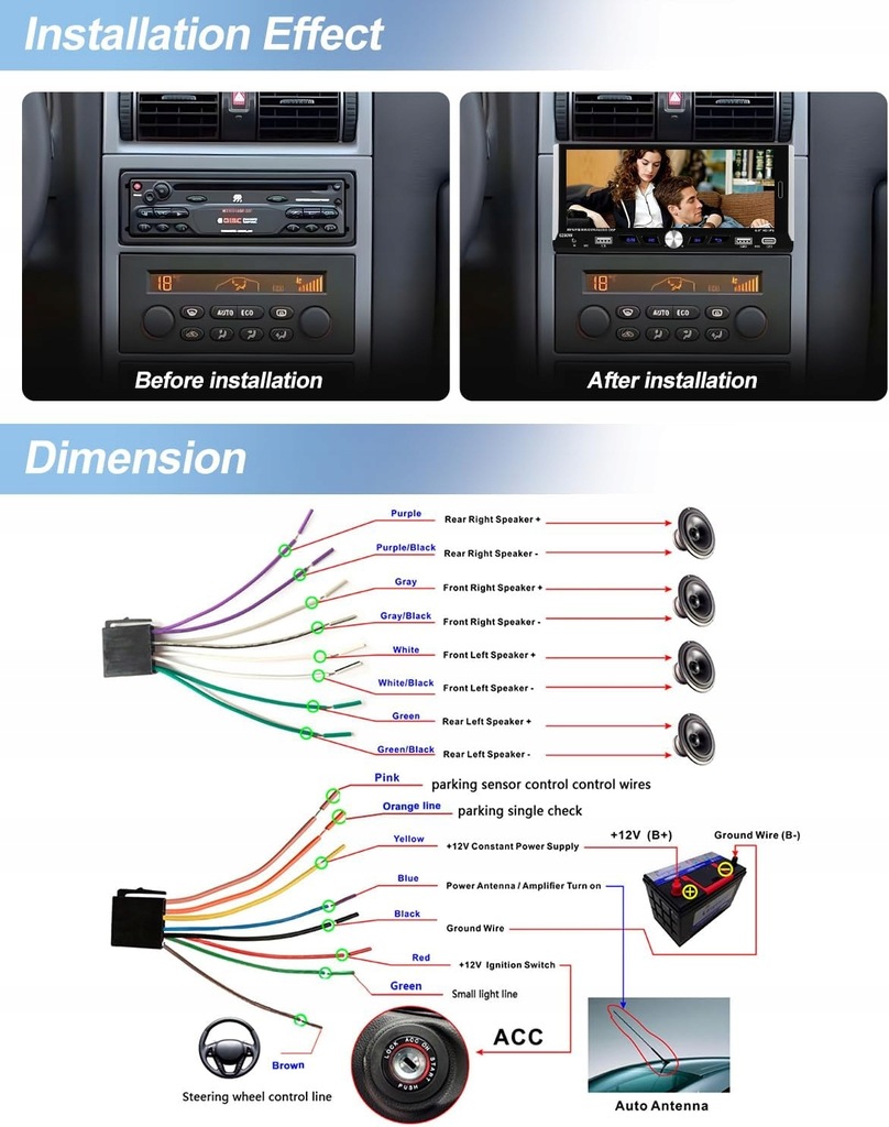 - 【Sterowanie z kierownicy/kamera cofania】: Radio samochodowe 1 Din z ekranem i systemem Android Auto obsługuje funkcję sterowania z kierownicy. Jednocześnie obsługuje także połączenie kamery cofania. Po podłączeniu tylnej kamery interfejs cofania zostanie uruchomiony podczas cofania, dzięki czemu cofanie będzie łatwiejsze i bezpieczniejsze.