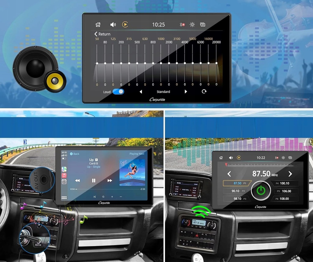Przenośne radio samochodowe CARPURIDE 9" kompatybilne z samochodami CarPlay i Android. Po podłączeniu go bezprzewodowo lub za pomocą kabla możesz korzystać ze wszystkich najlepszych funkcji swojego telefonu na czystym, bezpiecznym i łatwym w obsłudze ekranie dotykowym HD. Bezprzewodowo lub za pomocą kabla można bez problemu sterować nawigacją GPS, wiadomościami, połączeniami telefonicznymi, muzyką Bluetooth i Siri.