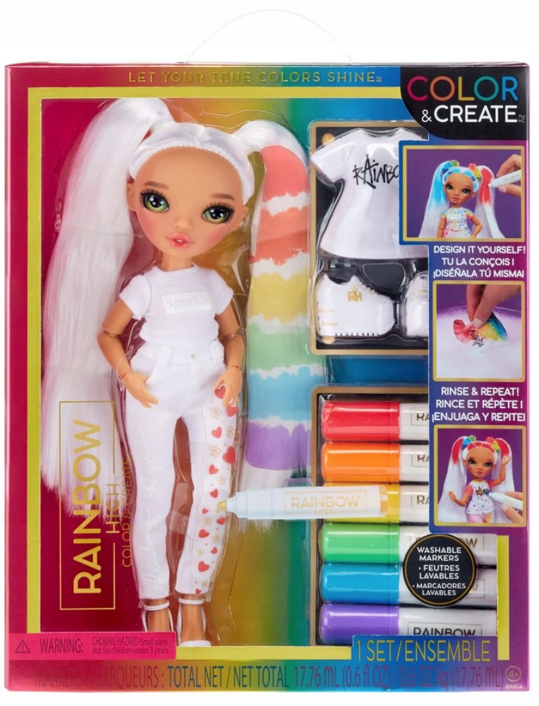 Rainbow High Color & Create - bądź jak uczennica słynnej szkoły i projektuj własne stroje! Odkryj lalkę w białym stroju, który możesz pokolorować zmywalnymi flamastrami! Stwórz własną lalkę Rainbow High!