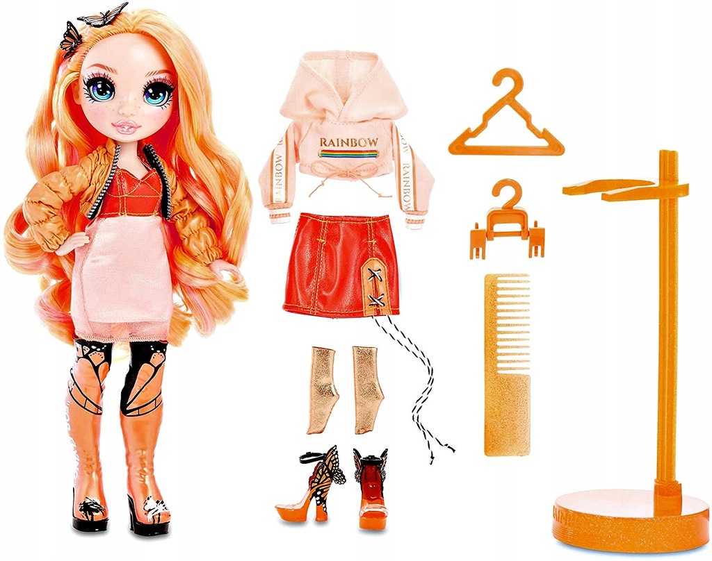 - akcesoria: pomarańczowy, brokatowy grzebień; pomarańczowy stojak dla lalki; dwa wieszaki.