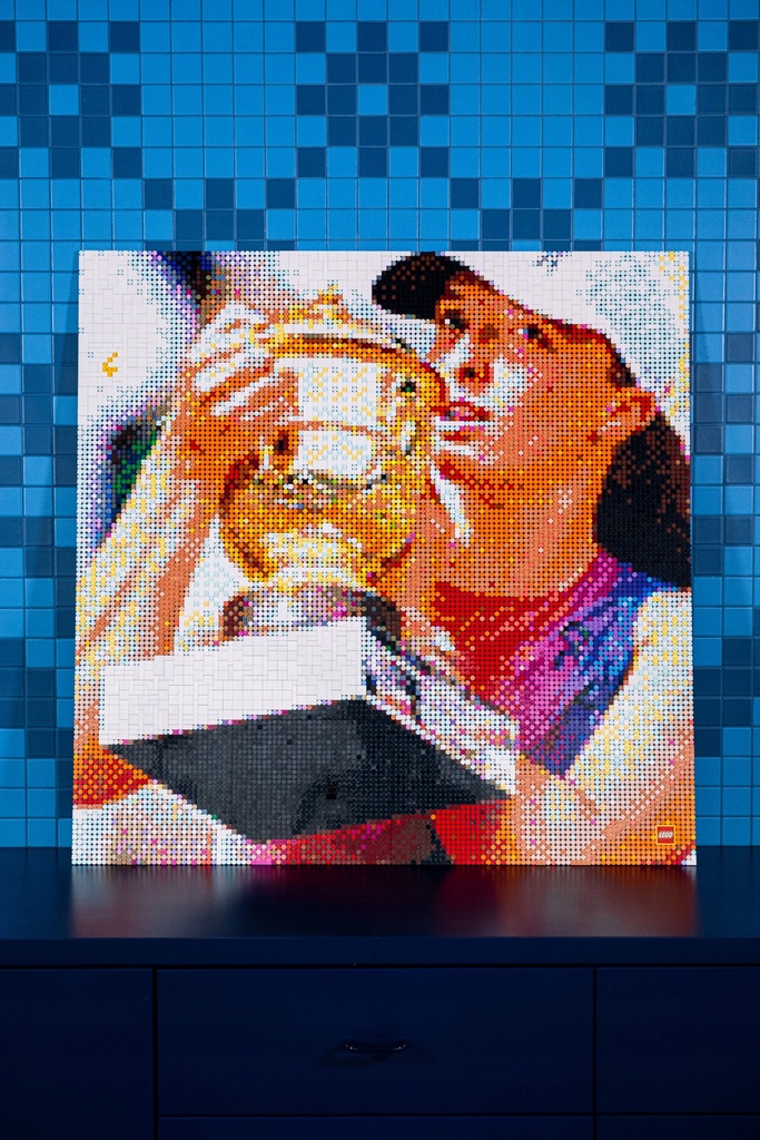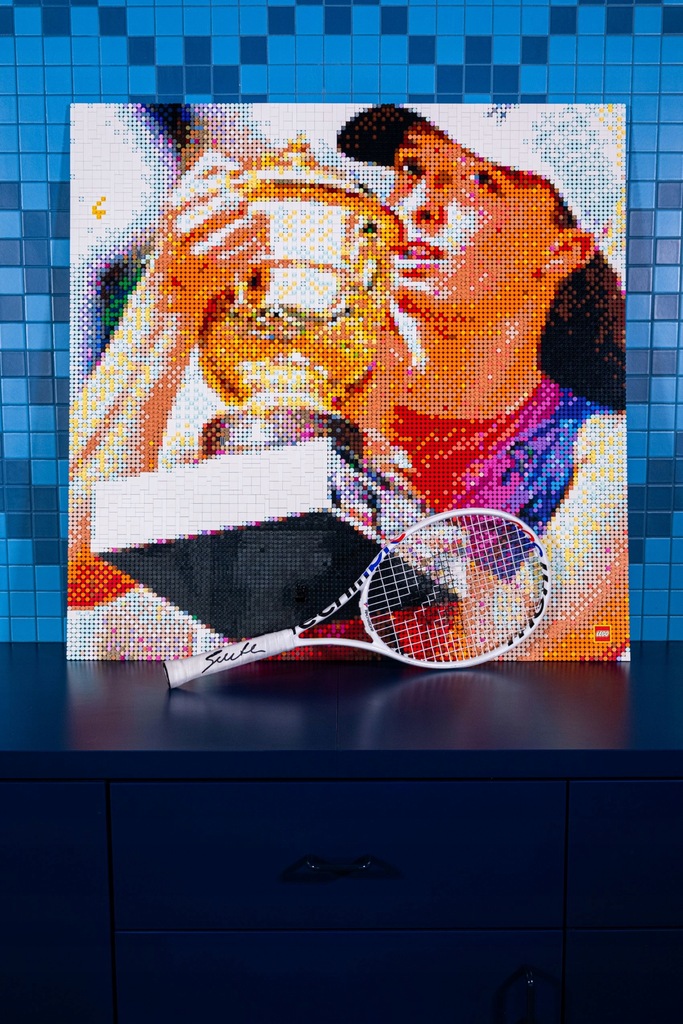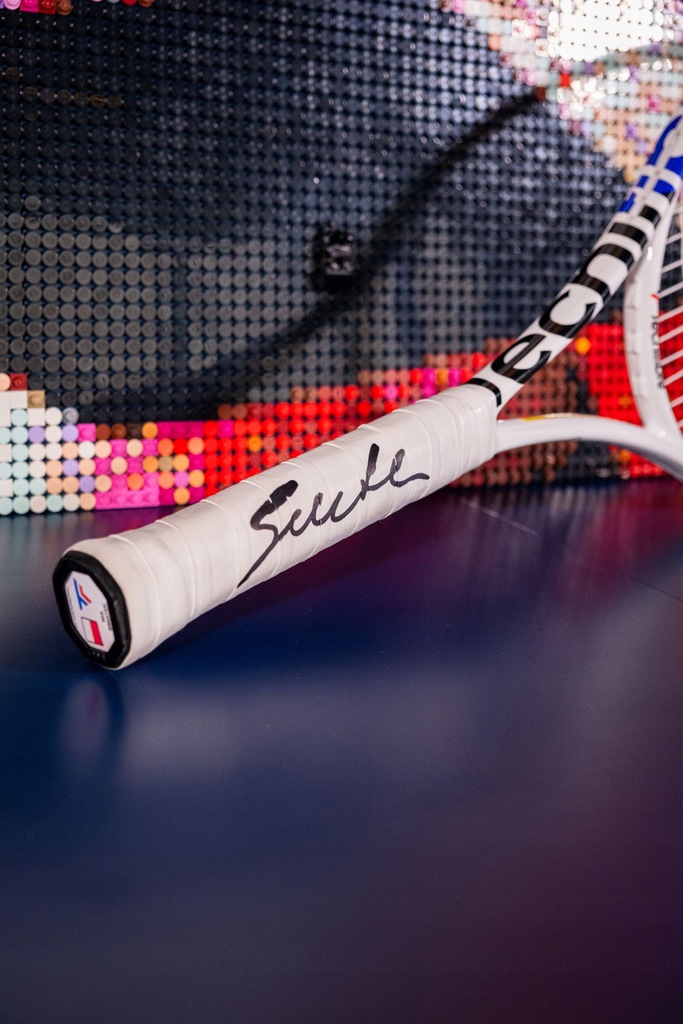 Personalizowana specjalnie dla tenisistki rakieta Tecnifibre z sezonu 2024 z jej autografem oraz unikalny obraz z klocków LEGO upamiętniający zwycięstwo w Roland Garros.