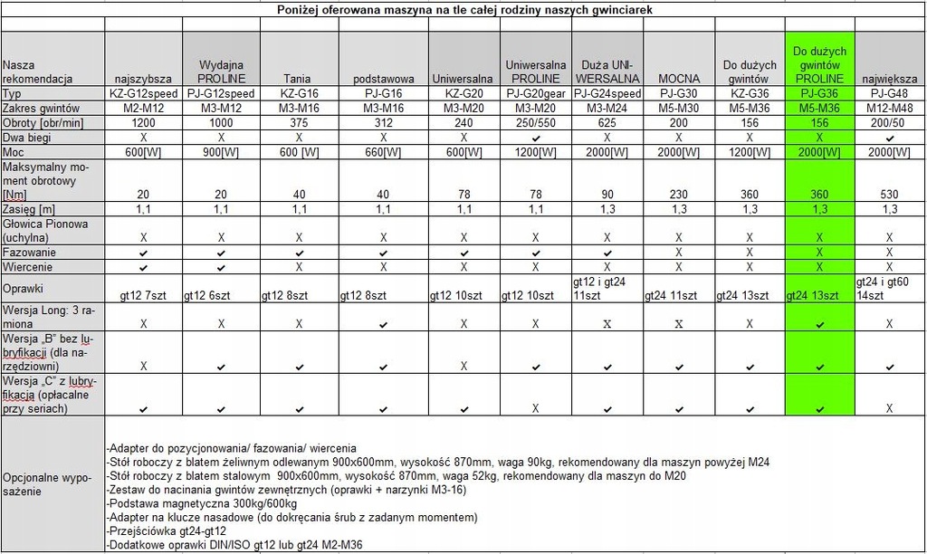 - Bogatą ofertę wyposażenia urządzenia w akcesoria do gwintowania